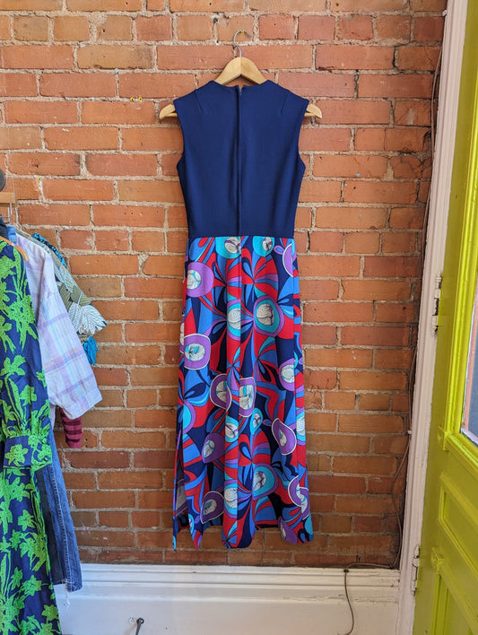 1960s Gilmar Blue Maxi Dress With Mod Print Skirt