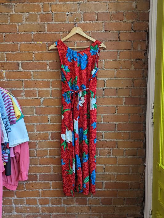 1990s Thums Up Red Hibiscus Print Maxi Dress