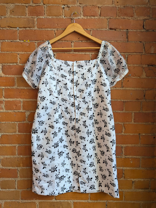 1990s White Puff Sleeve Mini Dress With Black Puff Paint Roses
