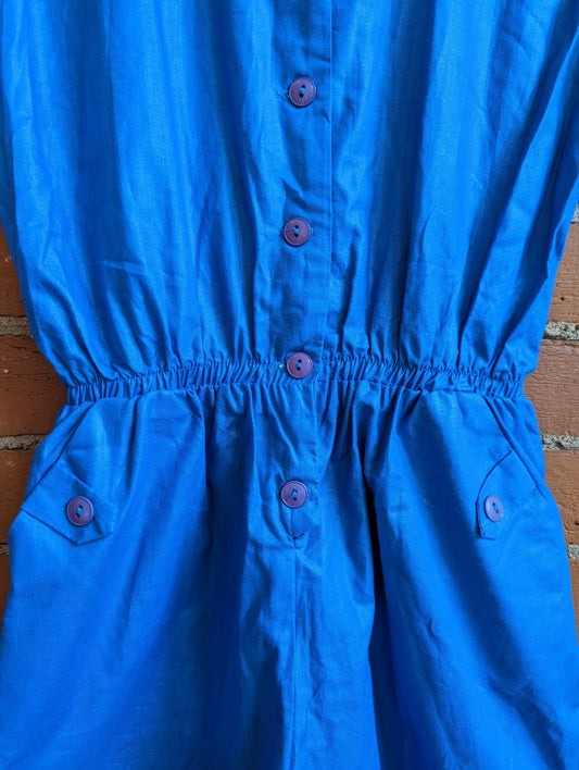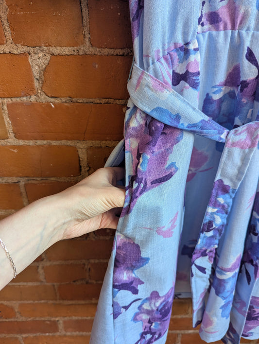 1970s Blue Barkcloth Dress With Purple, Blue and White Floral Print