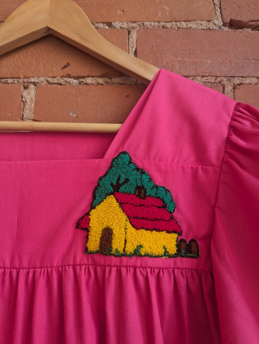 1970s Bordados Tiscareña Bright Pink House Dress With Latch Hook Details