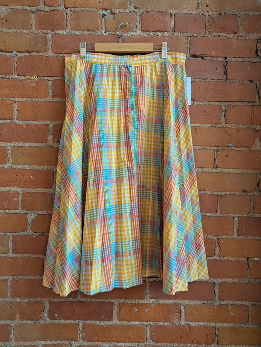 1970s Seersucker Pleated Plaid A-Line Midi Skirt