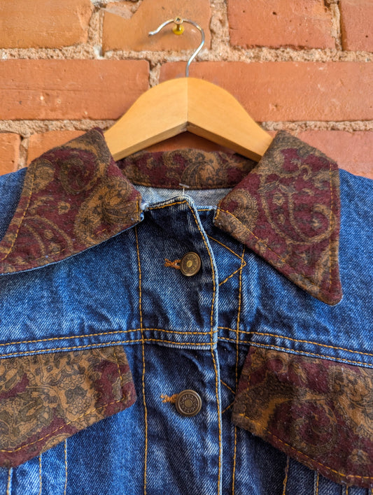 1980s Gitano Cropped Dark Wash Denim Jacket With Brown Paisley Accents