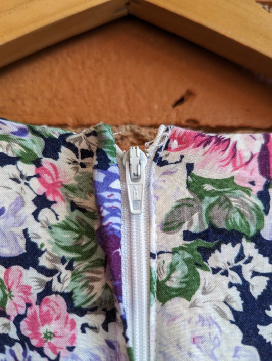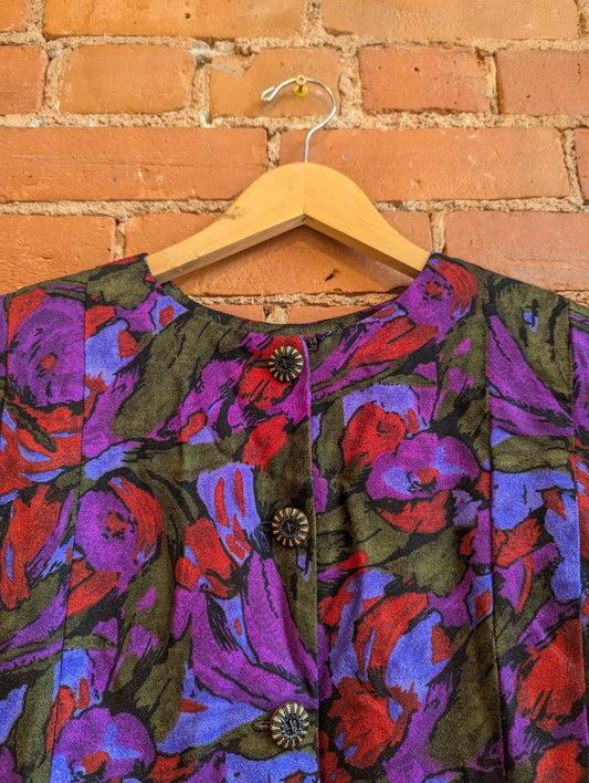 1980s Lai's Dark Purple, Pink, Red and Green Floral Print Dress