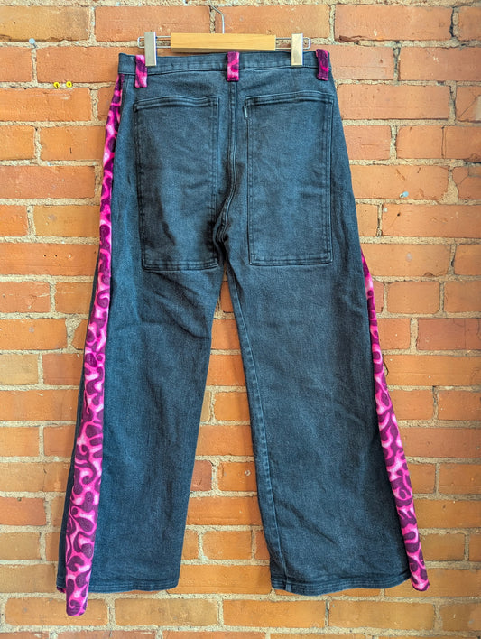 1990s Serious Wide Leg Washed Black Jeans With Pink Faux Fur Accents
