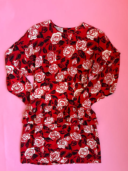 80's Red Silk Rose-Print Dress