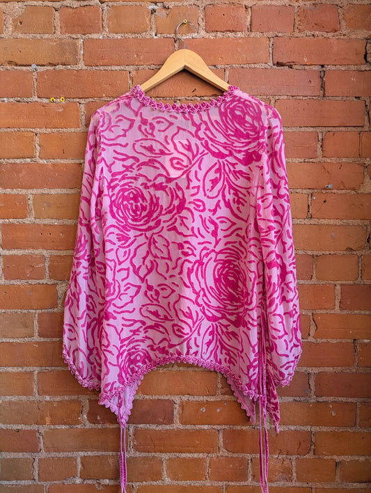 1990s Kozlowska Pink Sheer Bell Sleeve Top With Velvet Rose Pattern