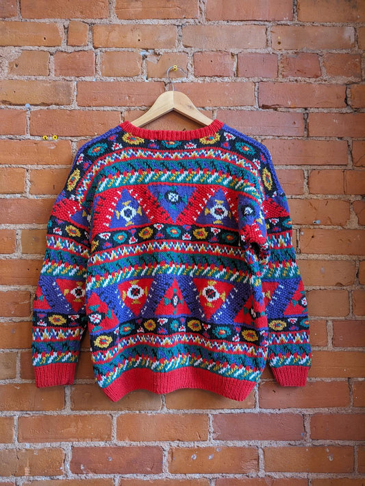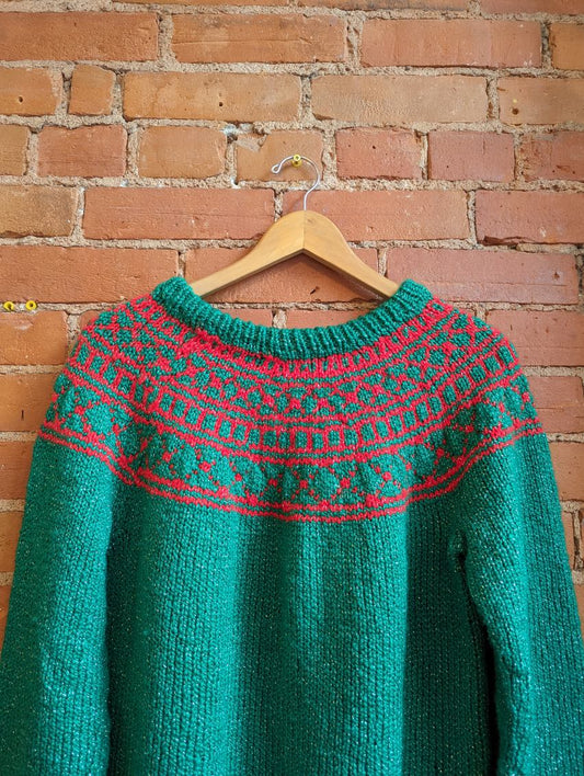 1980s Hand-Knit Red and Green Sweater With Silver Sparkle