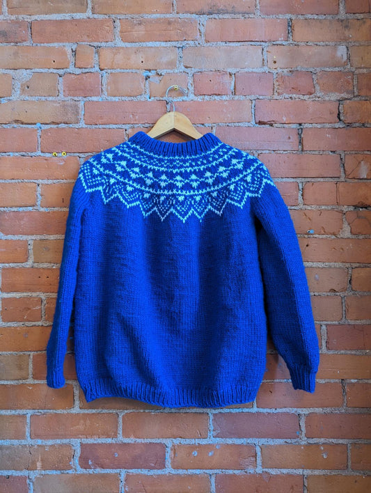 1980s Hand-Knit Blue and White Nordic Style Sweater