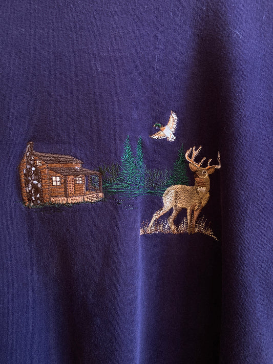 Embroidered Deer & Cabin Crewneck Sweater