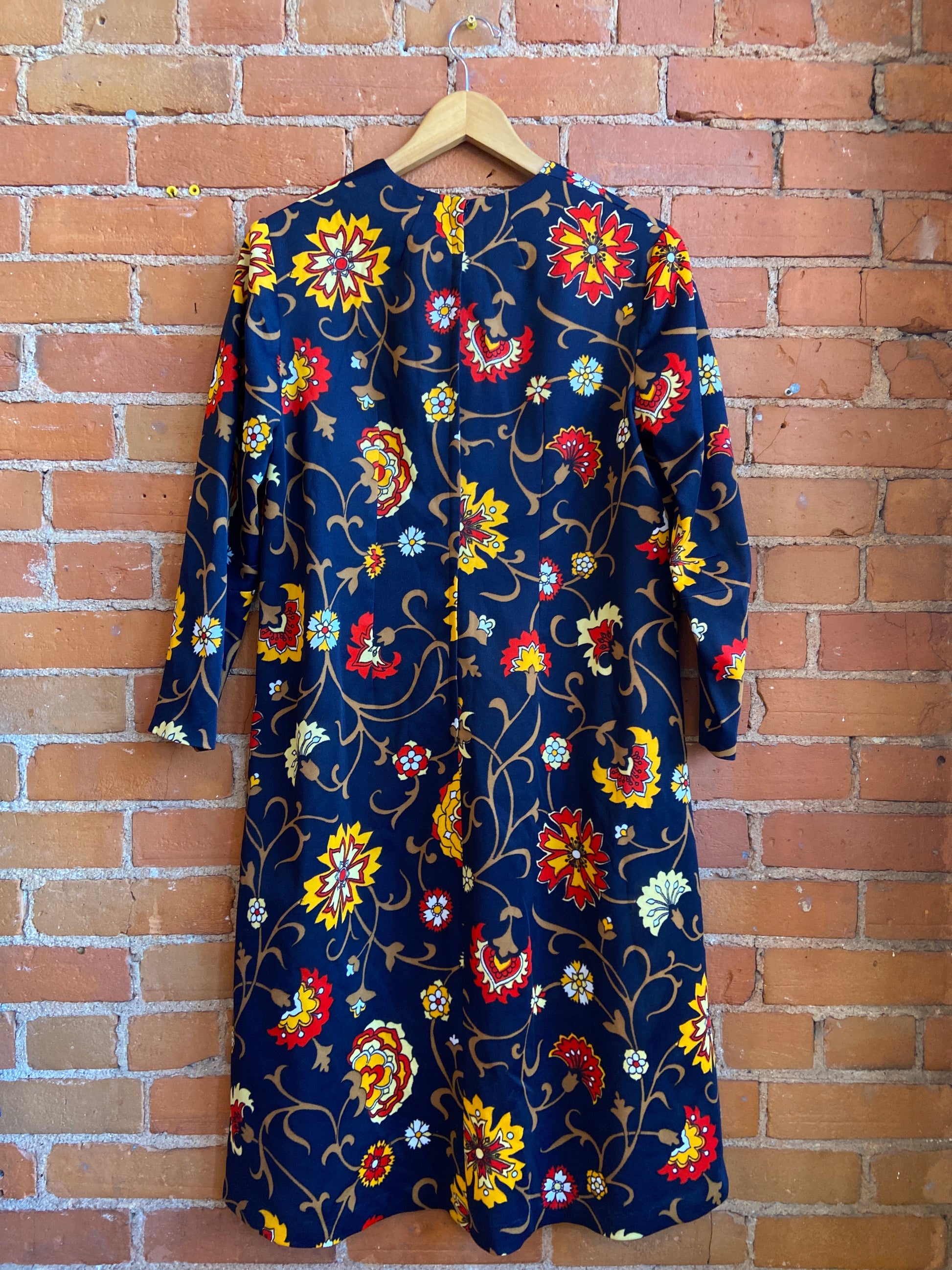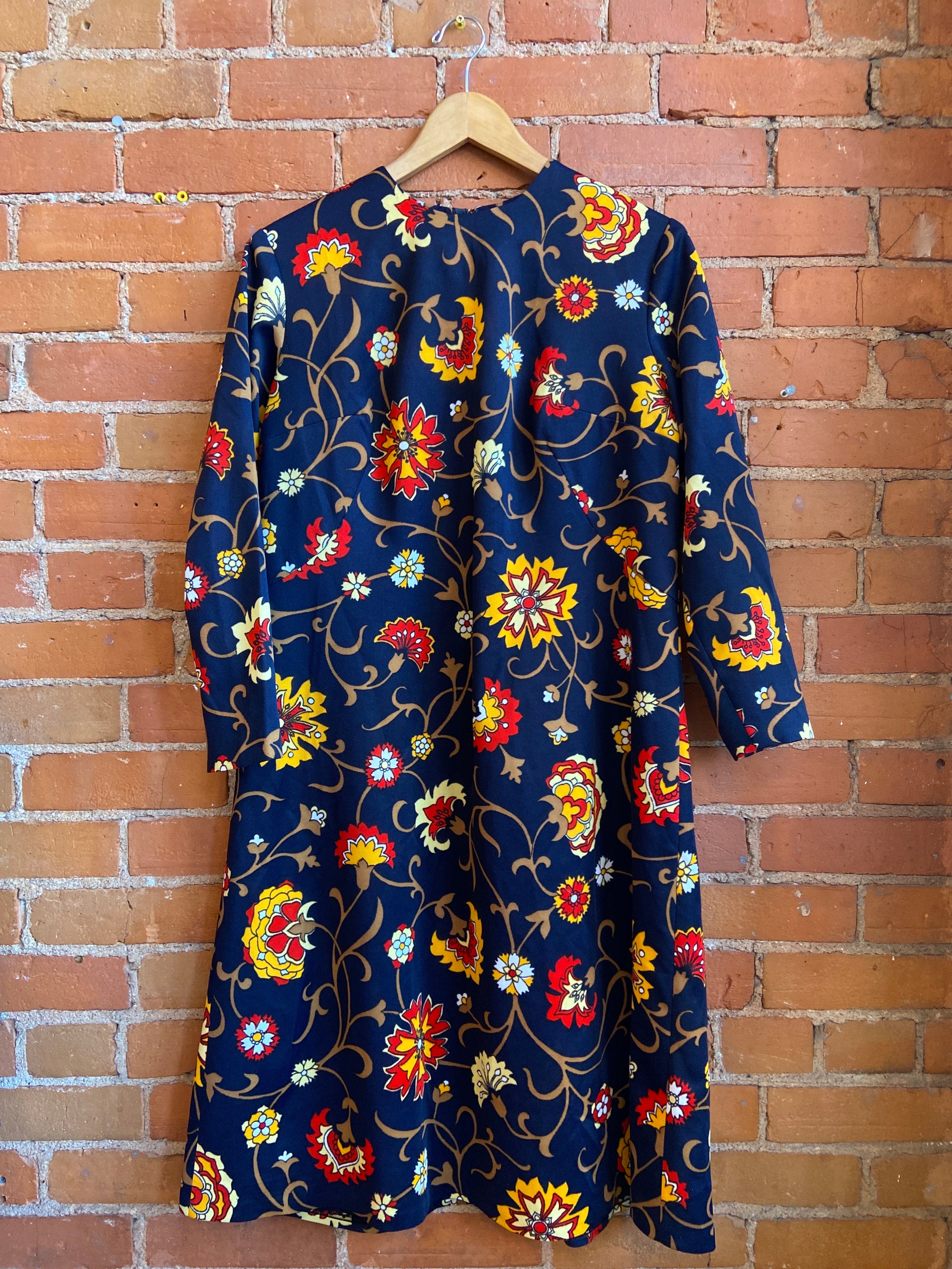 1960s Navy Blue Long Sleeve Dress With Warm-Toned Floral Print