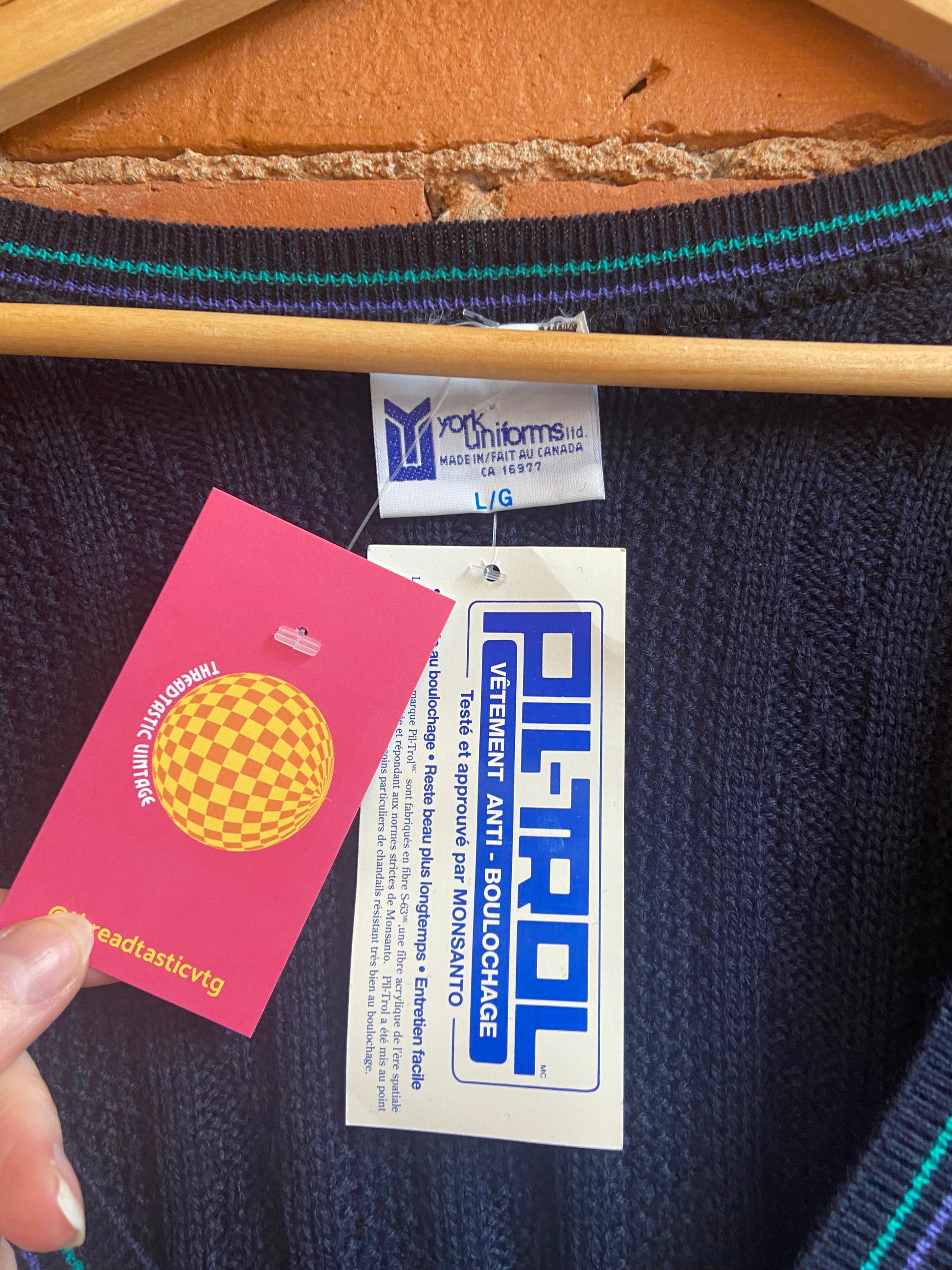 1970s NWT York Uniforms Navy Blue Cardigan With Green and Purple Striped Accents