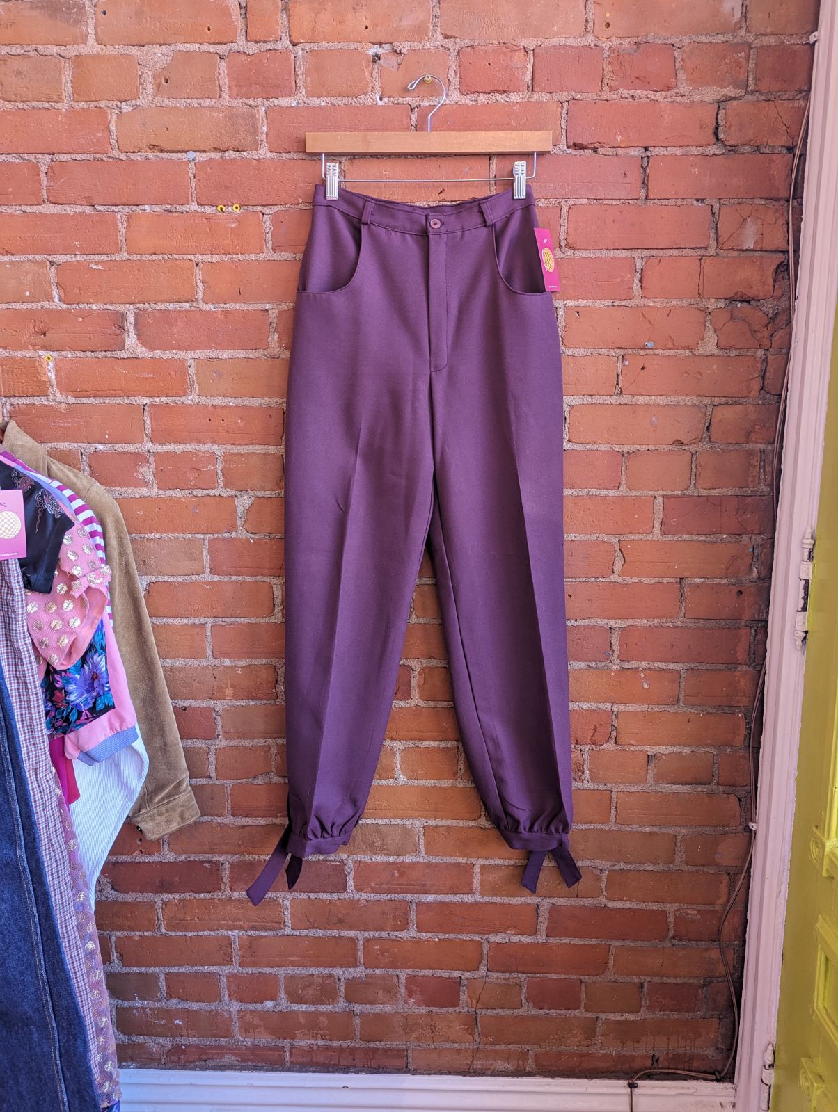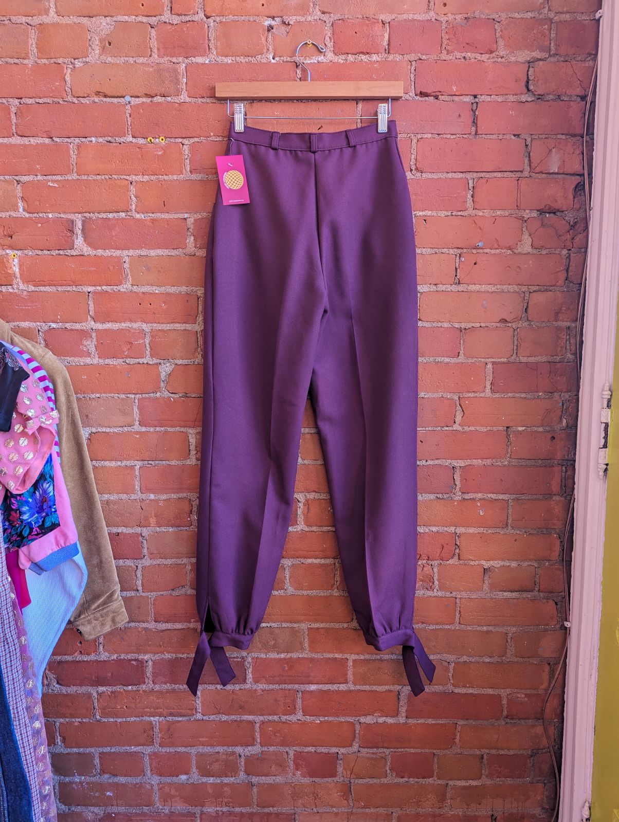 These 1970s pants are made out of what feels like a polyester material in a plum colour. They have a high-rise fit and tie details at the cuffs.