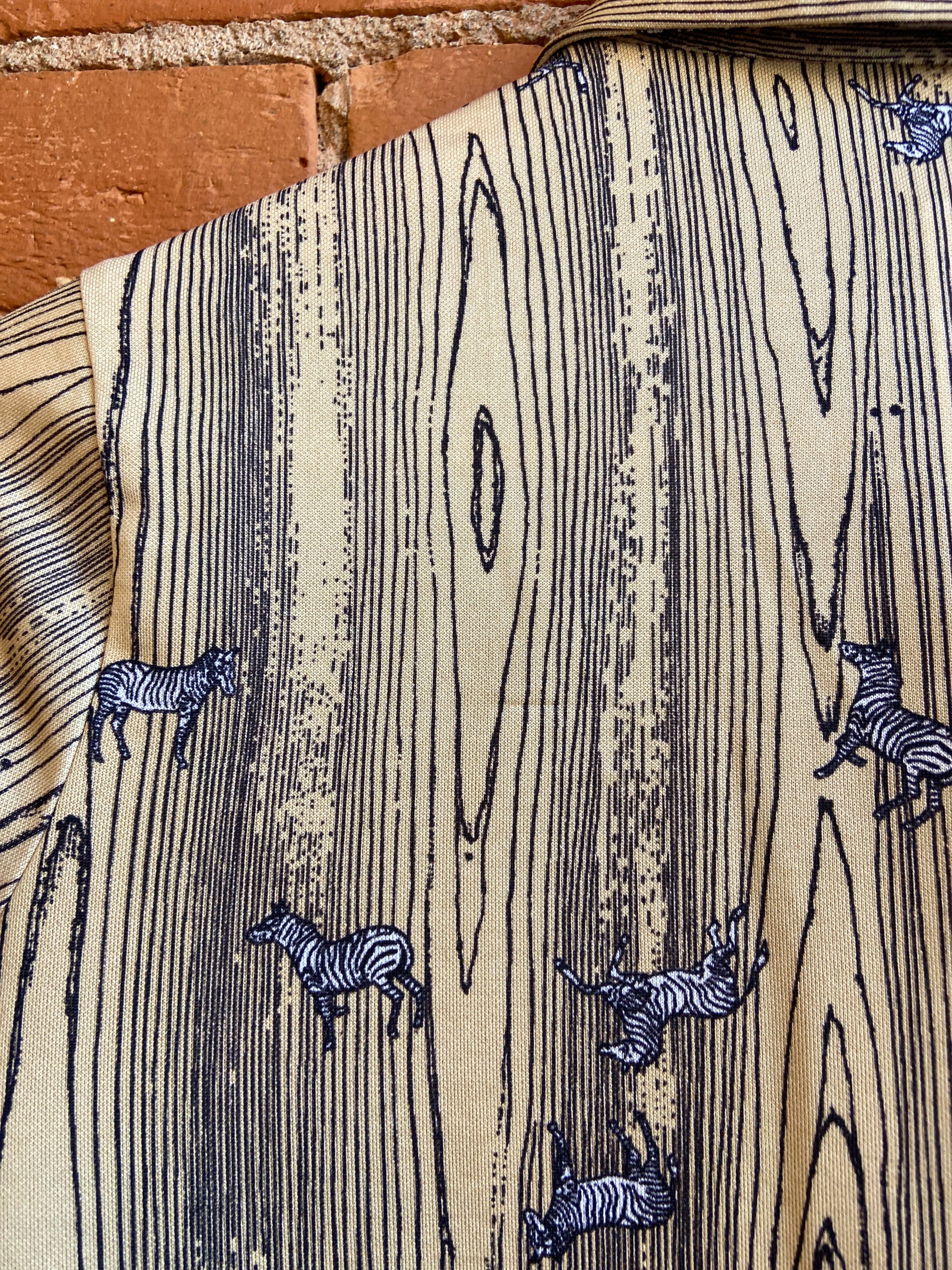 This 1970s Wayne Taylor dagger collar shirt is made out of a 100% polyester fabric and has a faux woodgrain and zebra print.