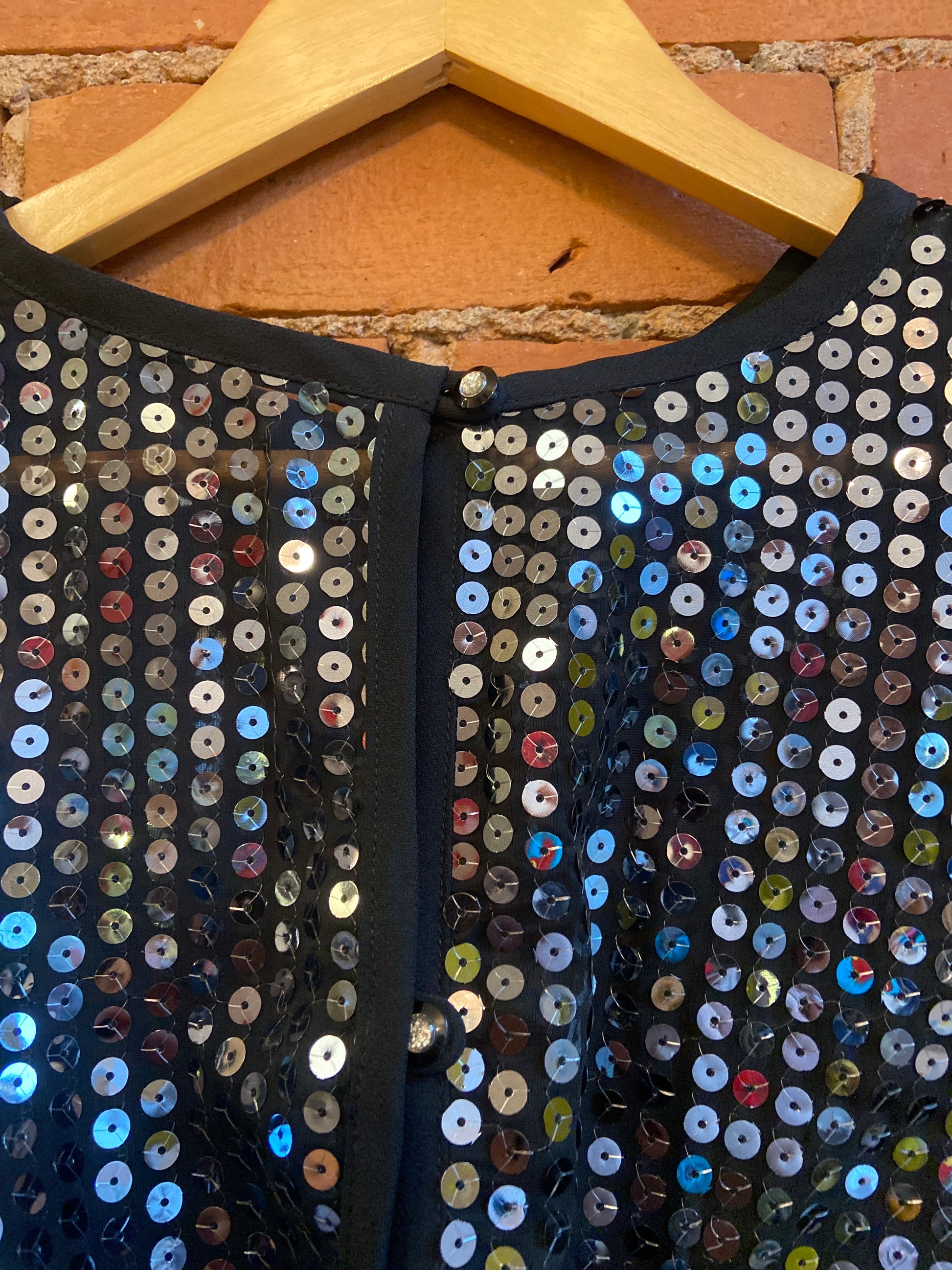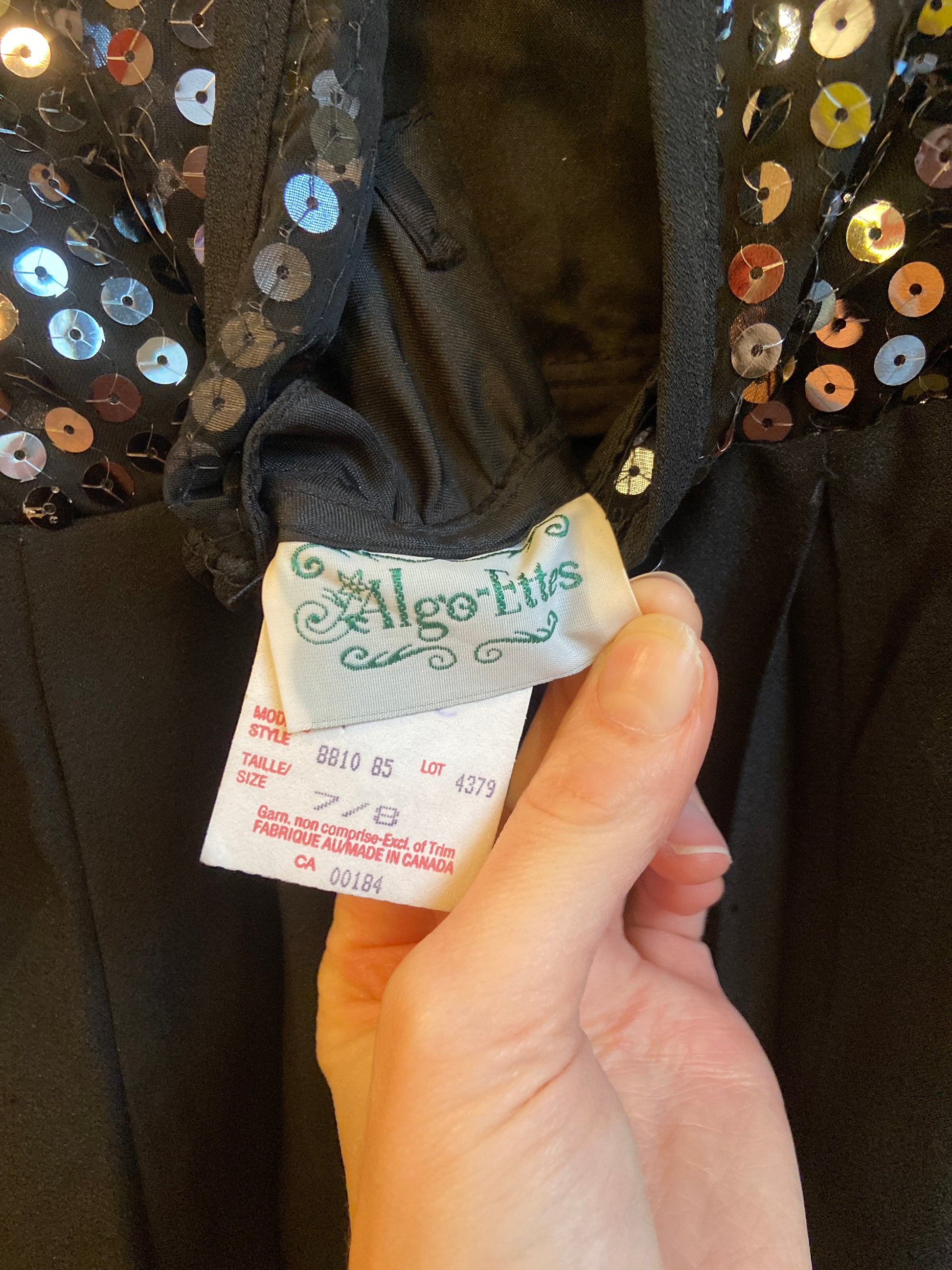 This 1980s Algo-Ettes dress is made out of a 100% polyester fabric in a black colour and has a mesh overlay bodice covered in sequins. As is: a couple of sequins are missing.