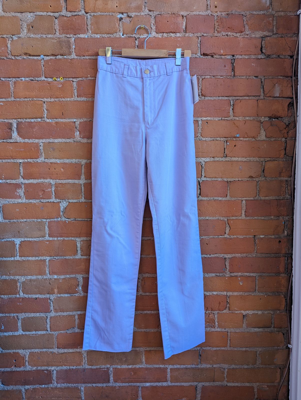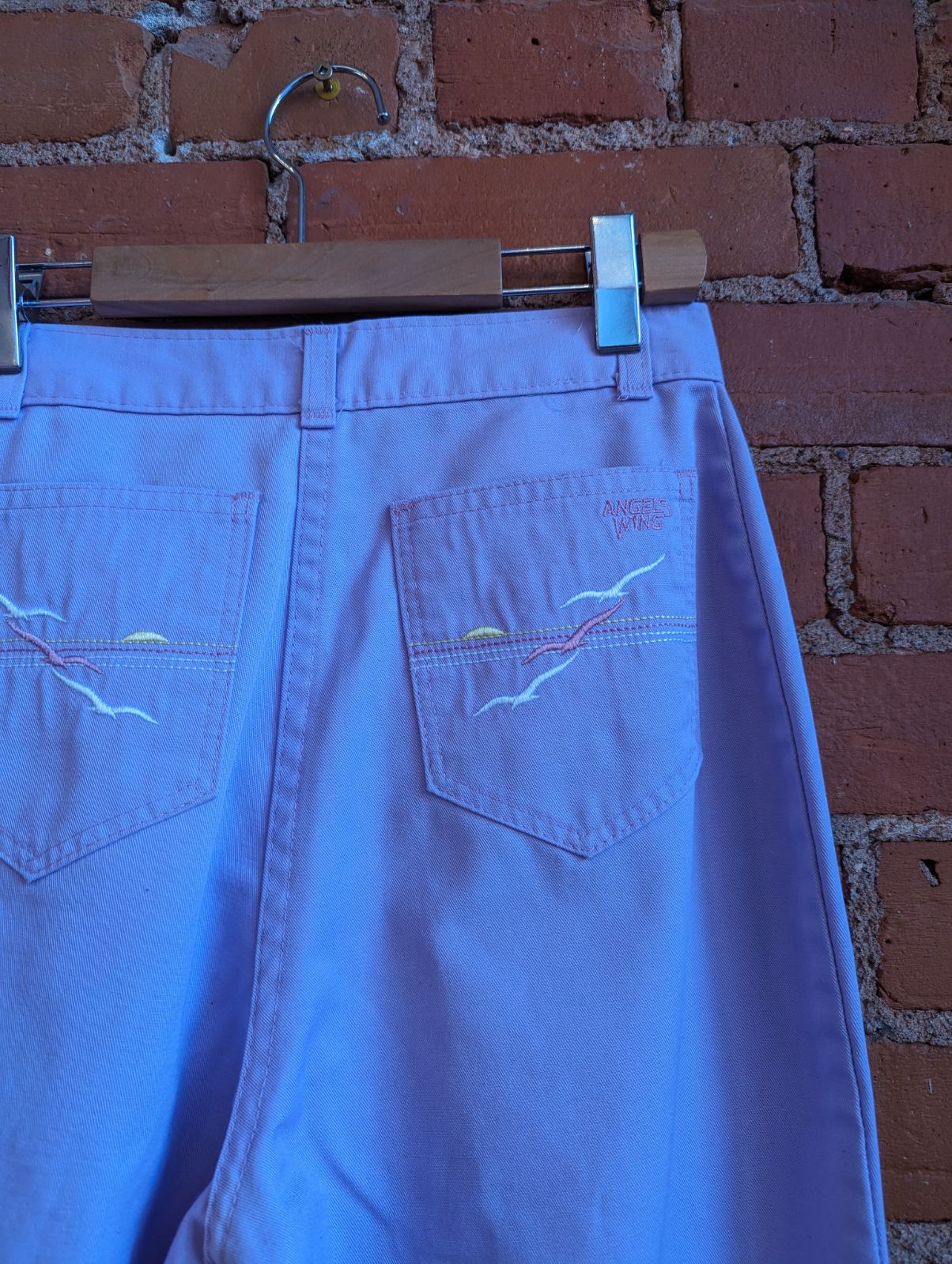 These 1980s Angels Wing straight leg pants are made out of what feels like a cotton blend in a pastel purple colour and have birds embroidered onto the back pockets. They have a raw hem.
