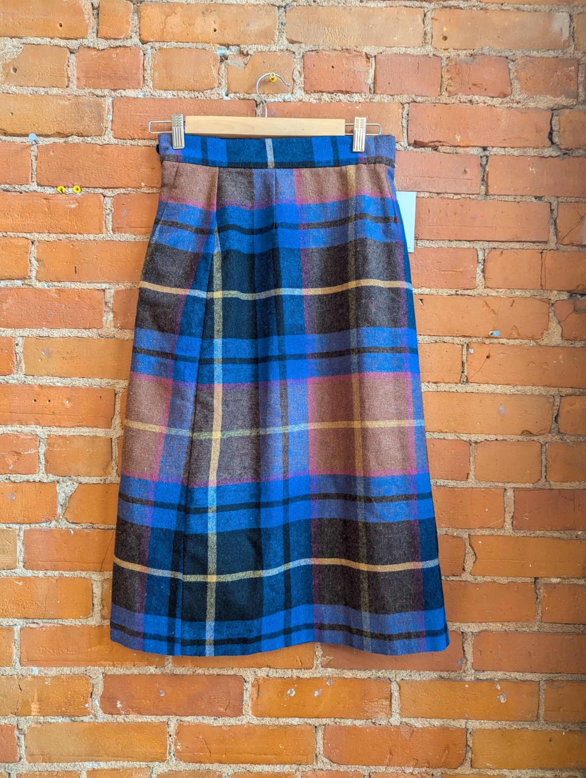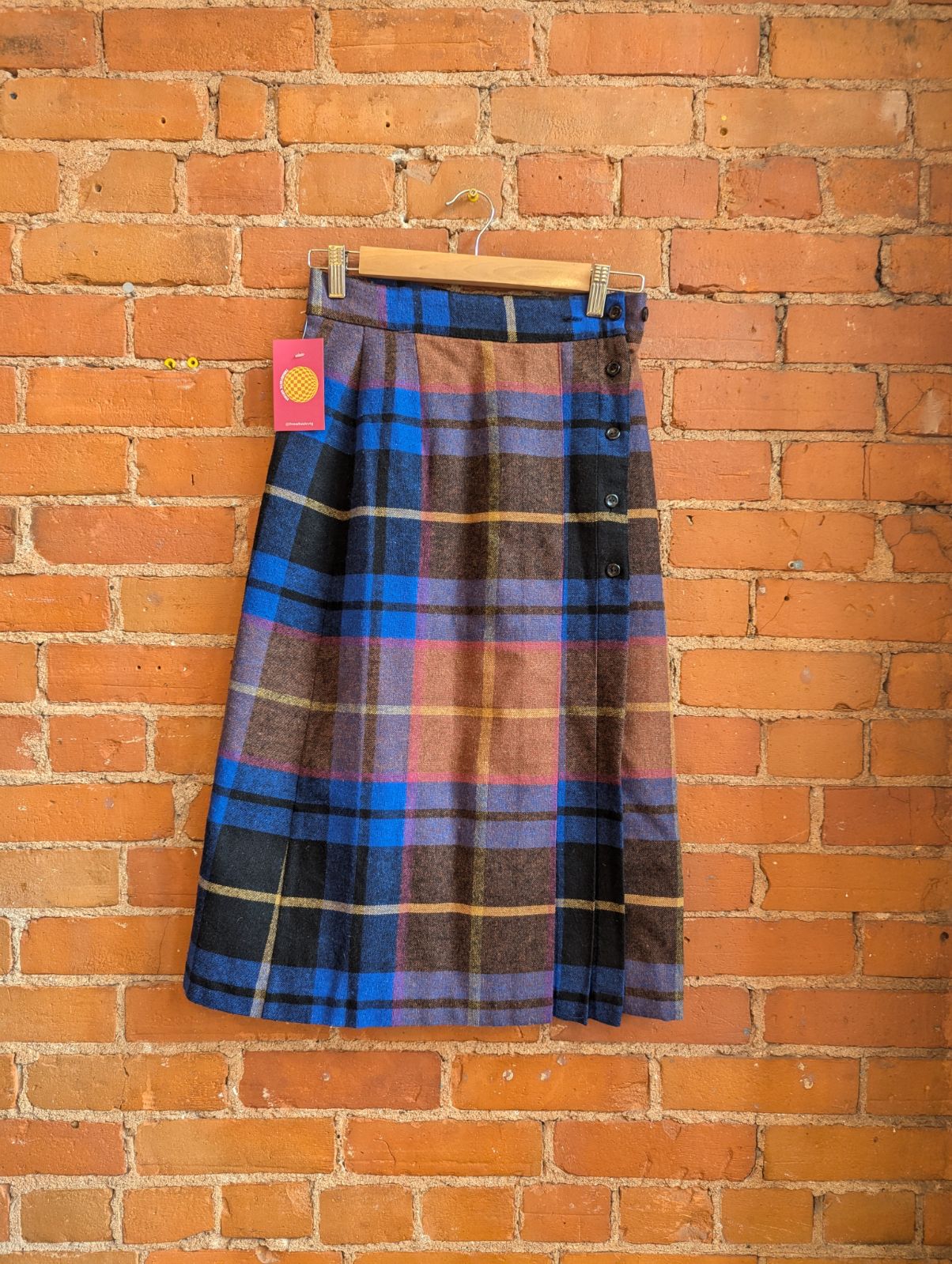 This 1980s pleated wool skirt is made out of a wool, polyester and acrylic blend and has an allover blue, yellow, pink and brown plaid pattern. It's fully lined on the inside.