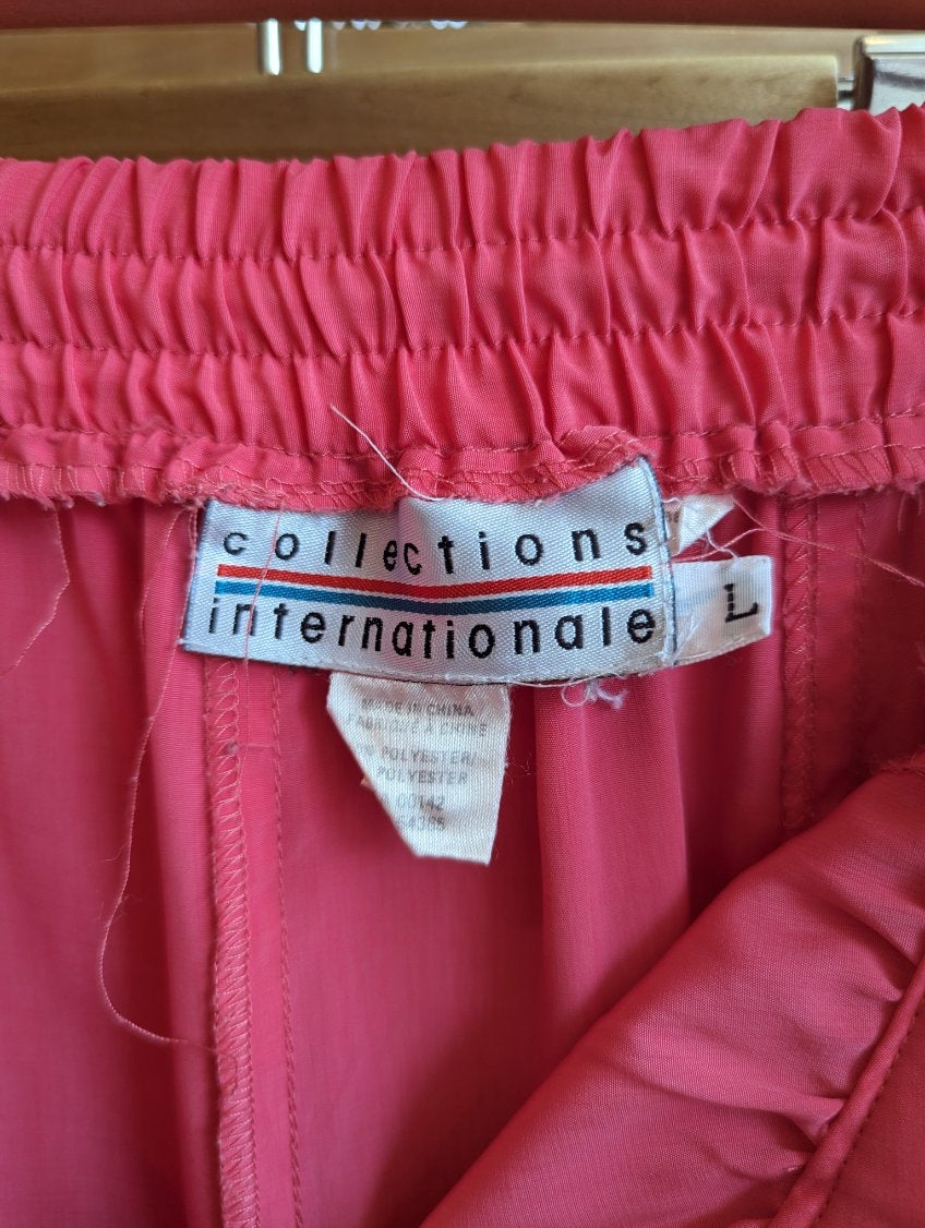 These 1980s Collections Internationale pants are made out of a pink 100% polyester fabric and have a high rise, wide leg fit. They also have two pockets and an elastic waist with buttons and a drawstring. As is: two small pulls near right pocket.