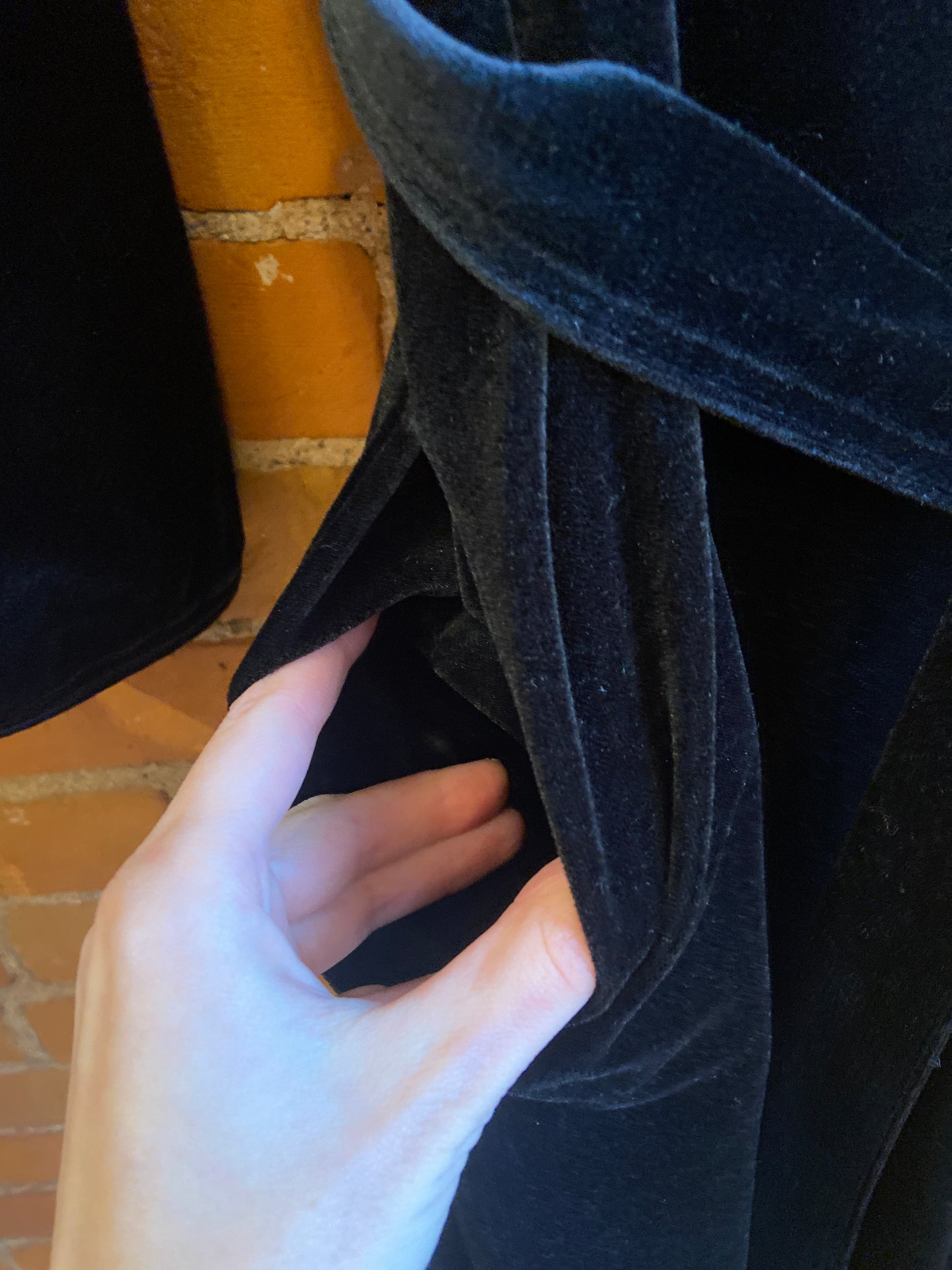 This 1980s Evelyn Pearson robe is made out of a polyester and nylon blend velour fabric in a black colour and has blue and green paisley trim around the collar and cuffs. It has two pockets.