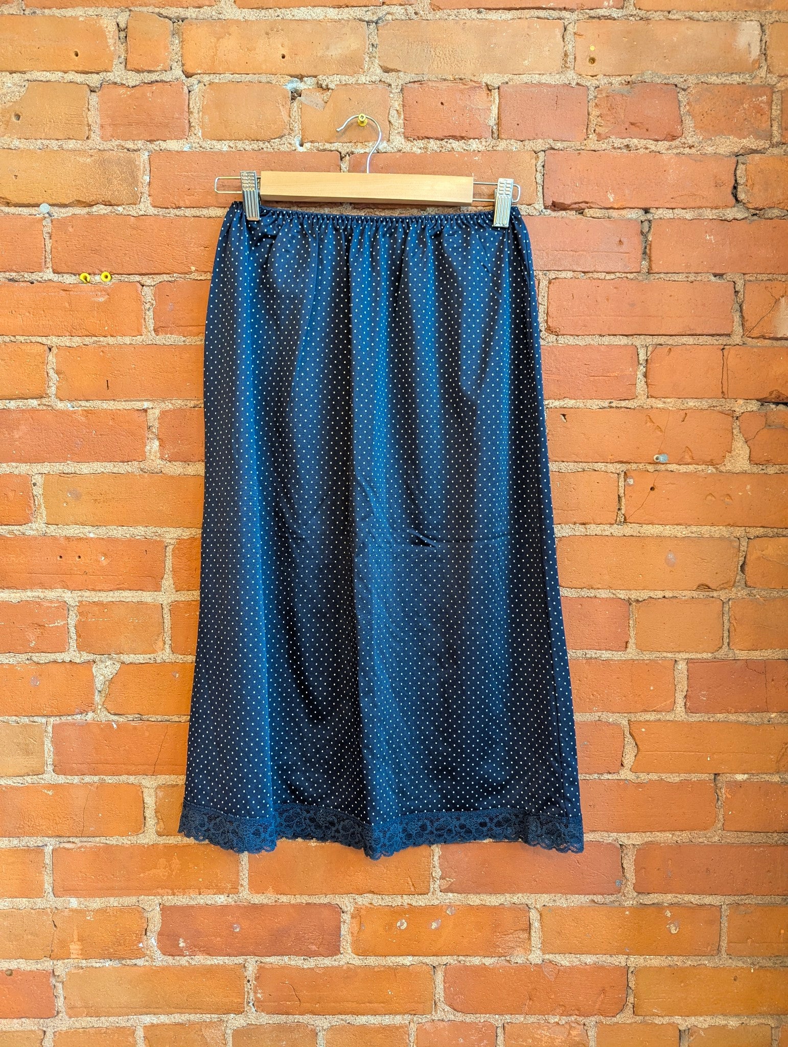 This 1980s slip skirt is made out of what feels like a nylon fabric in a navy blue colour and has an allover white micro polka dot print. Measurements: Waist 24"" to 34"" | Hips 40"" | Length 27""