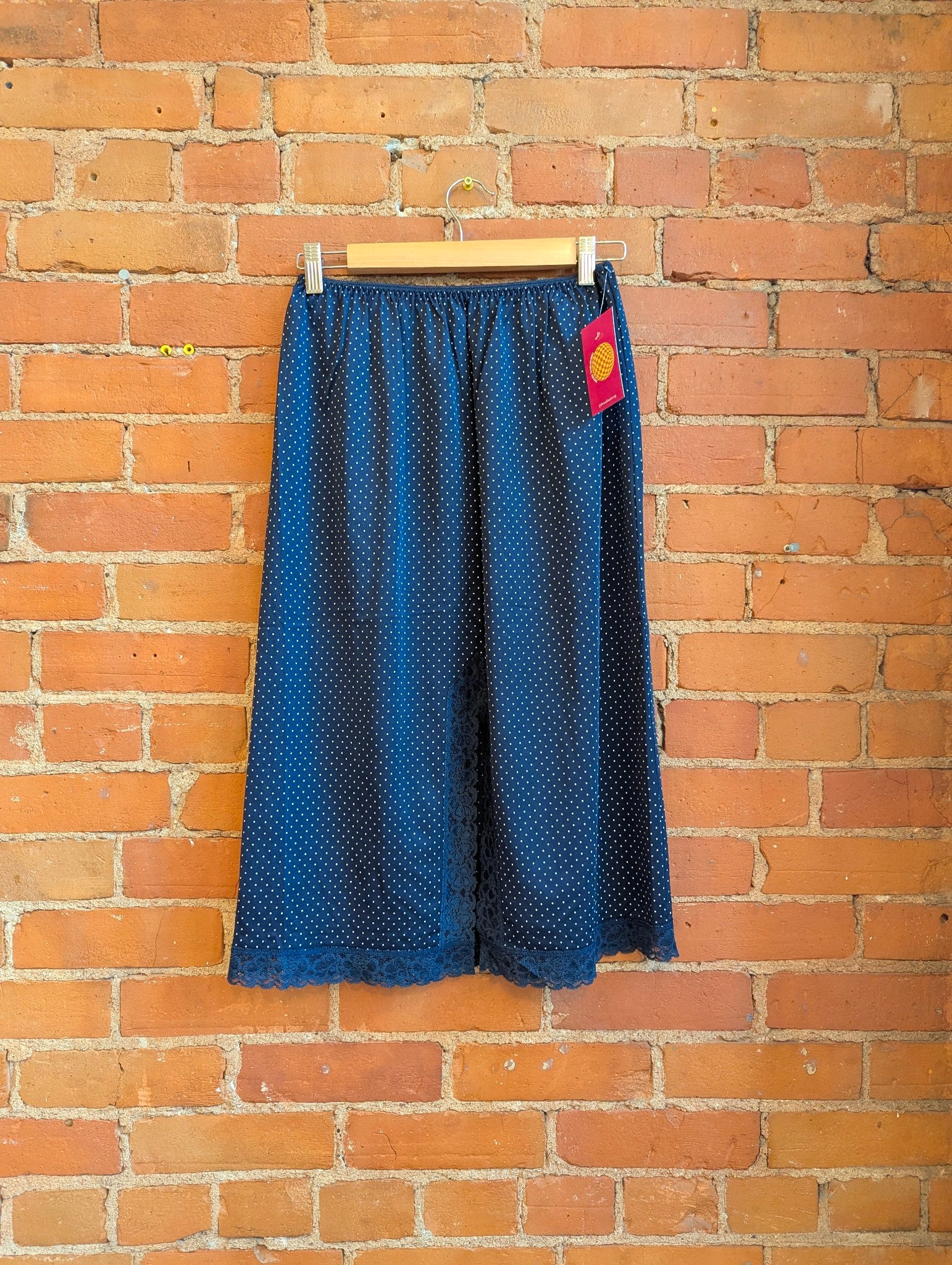 1980s Navy Blue Slip Skirt With White Micro Polka Dots