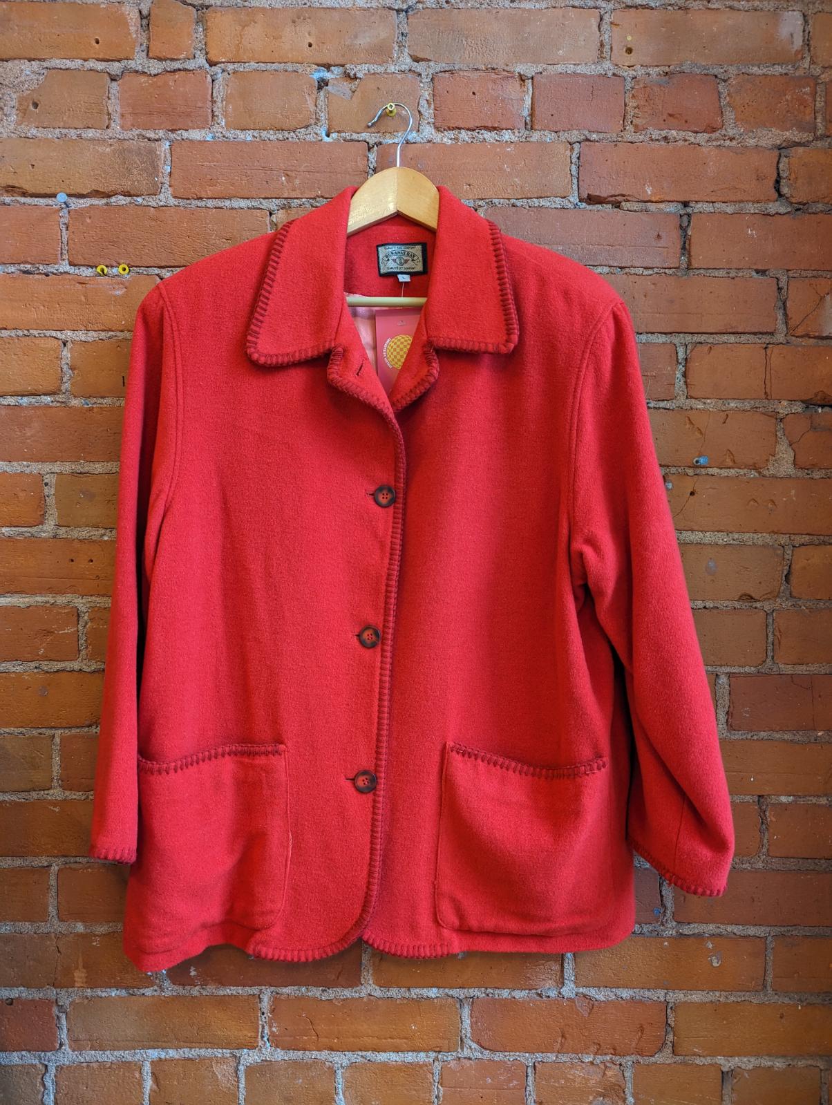 This 1980s Runaway Bay jacket is made out of a bright red acrylic, wool and polyester blend and is lined in a red viscose material. It has shoulder pads in the shoulders that are inside the lining so they would be difficult to remove.