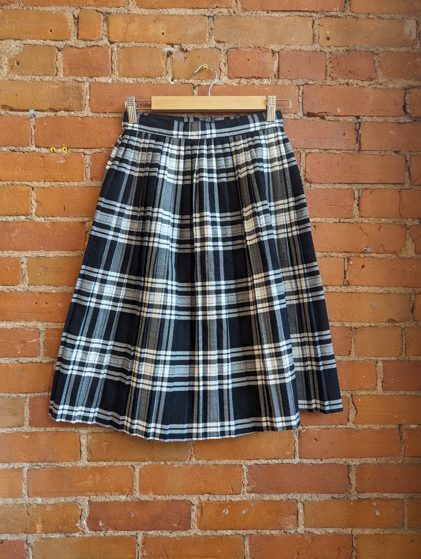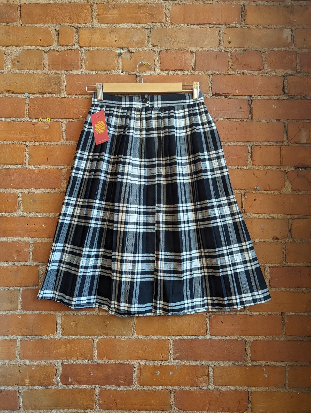 This 1990s pleated skirt is made out of a polyester and viscose blend and has an allover black and white plaid print.