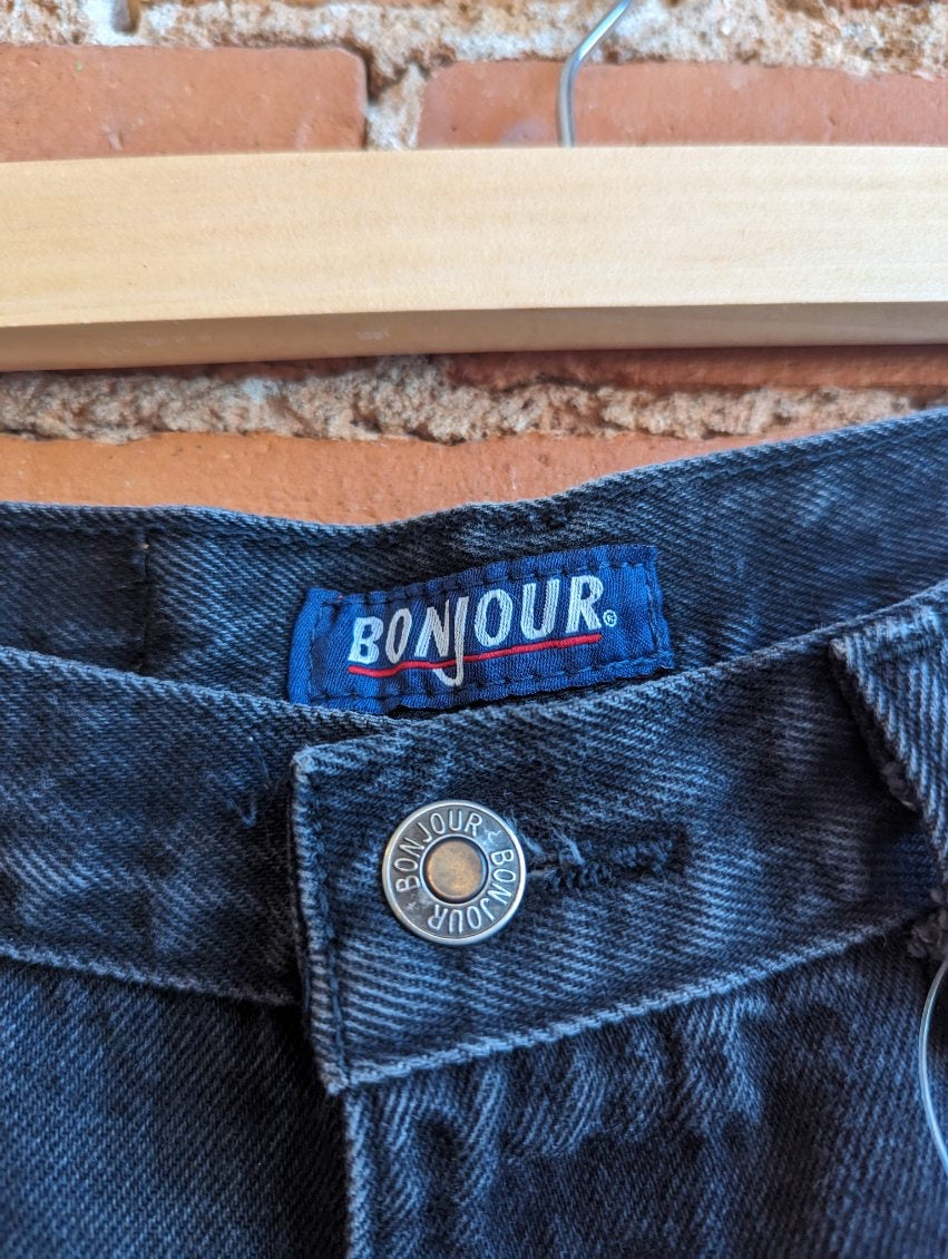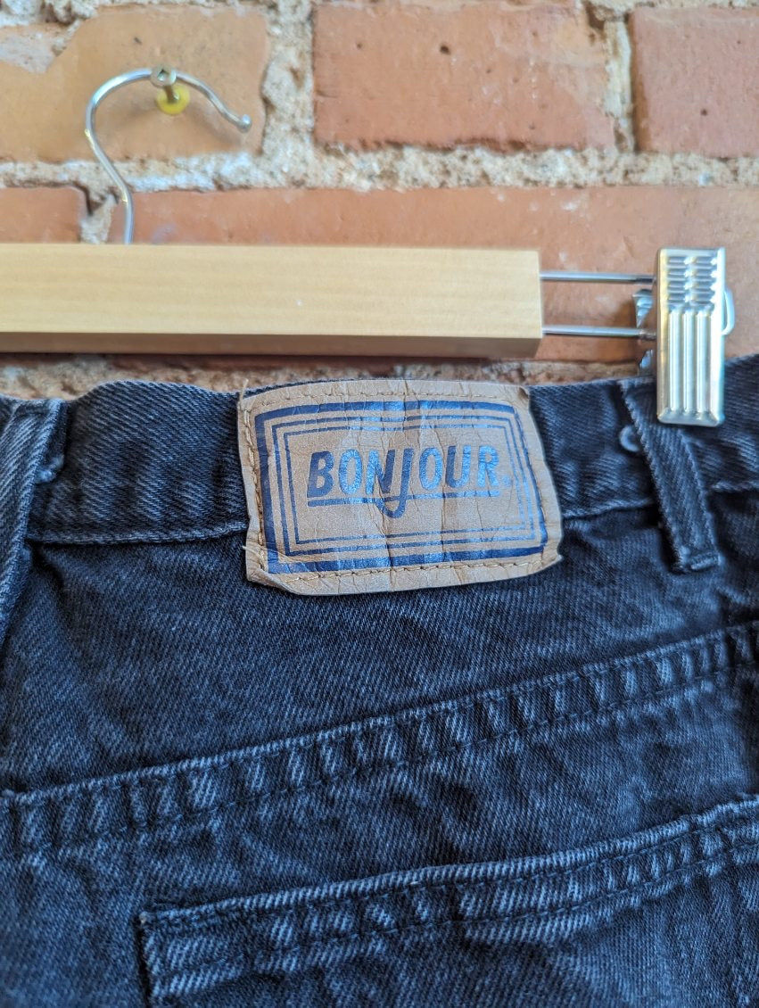 These 1990s Bonjour jeans are made out of a 100% cotton washed black denim and have a high rise, wide leg fit.