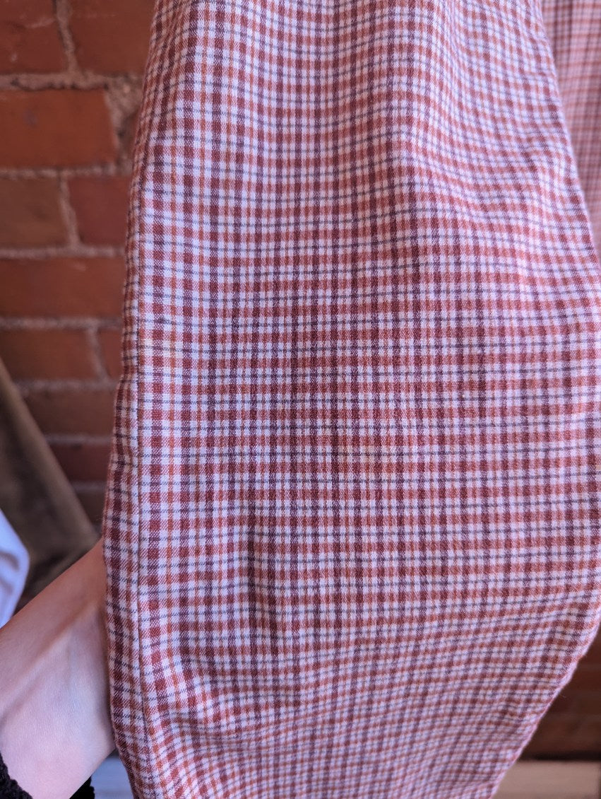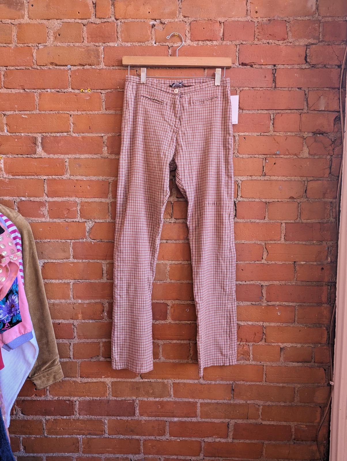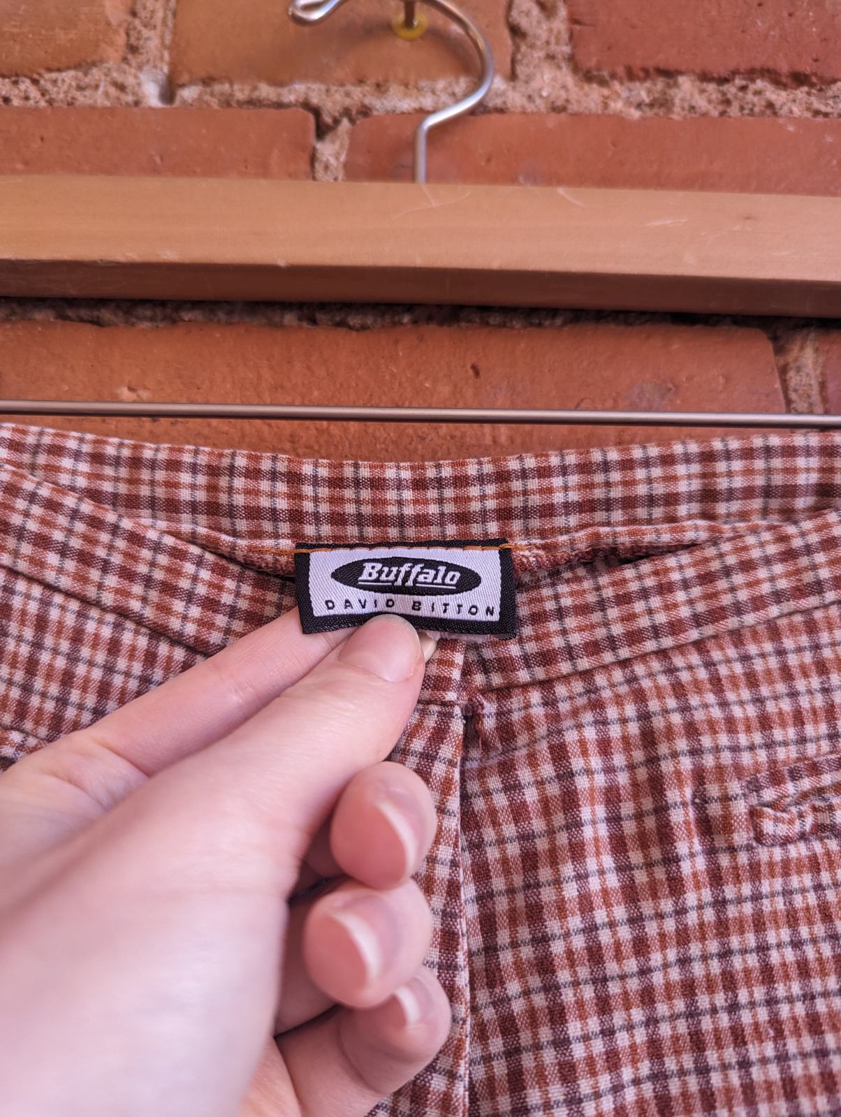 These 1990s Buffalo David Bitton straight leg pants are made out of what feels like a cotton blend and have an allover orange, white and brown plaid print. They have two faux pockets on the front. As is: small spot of puckering on the left pant leg.