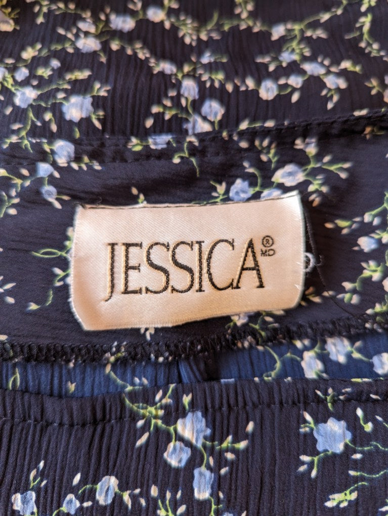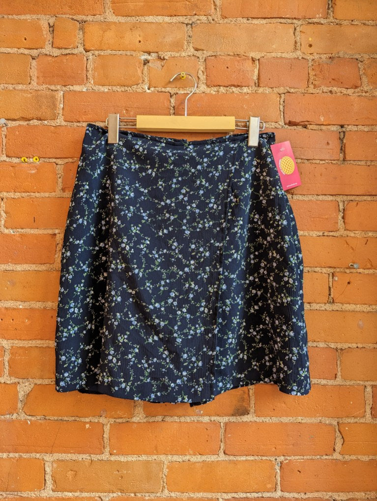 This 1990s Jessica skort is made out of what feels like a polyester fabric with a navy, blue, white and green floral print all over it. It has a zipper at the back to help you put it on, and a faux wrap detail at the front.