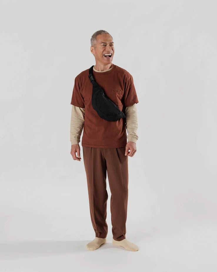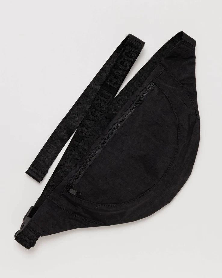 A streamlined heavyweight nylon crossbody with a sling shape that hugs the body. Wear across your body, over your shoulder or around your waist.
