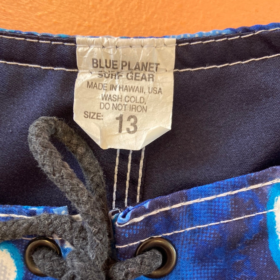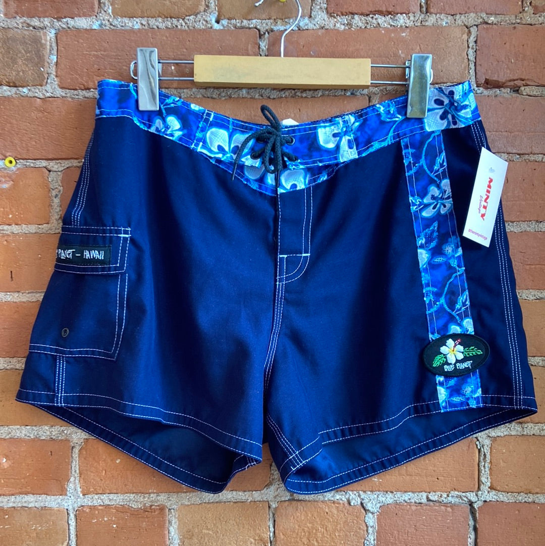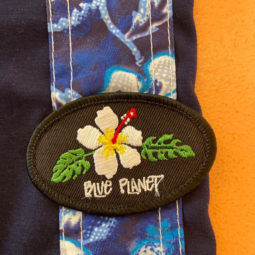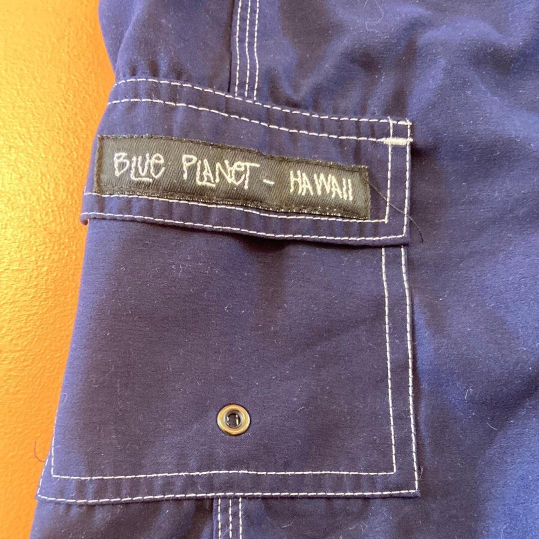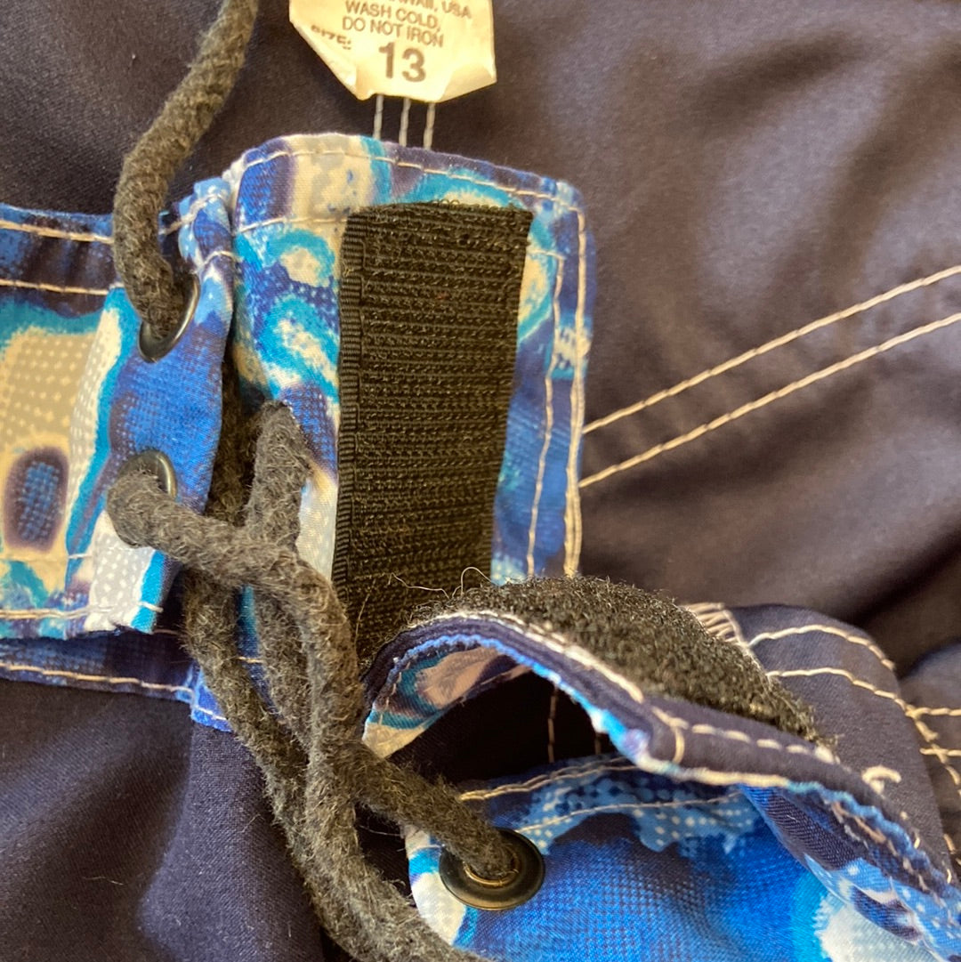 Navy blue with floral print trim, right leg velcro pocket, front velcro & drawstring closure. Waist size somewhat adjustable.