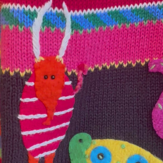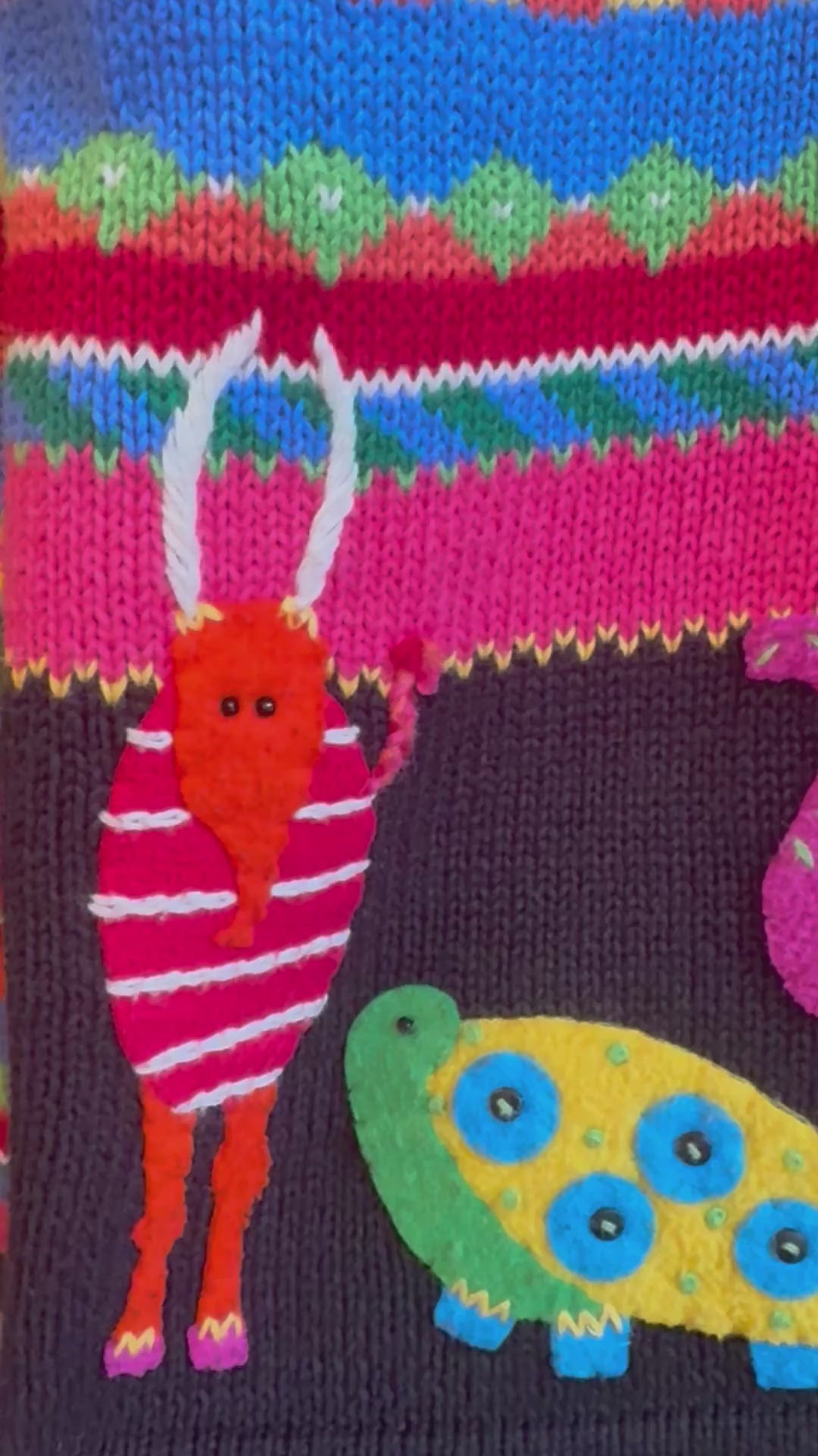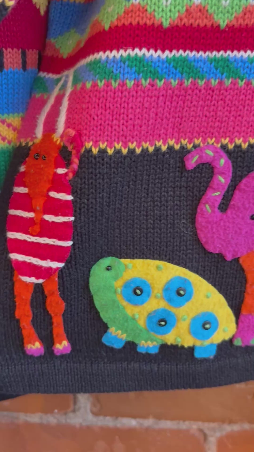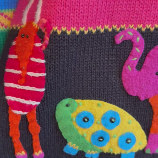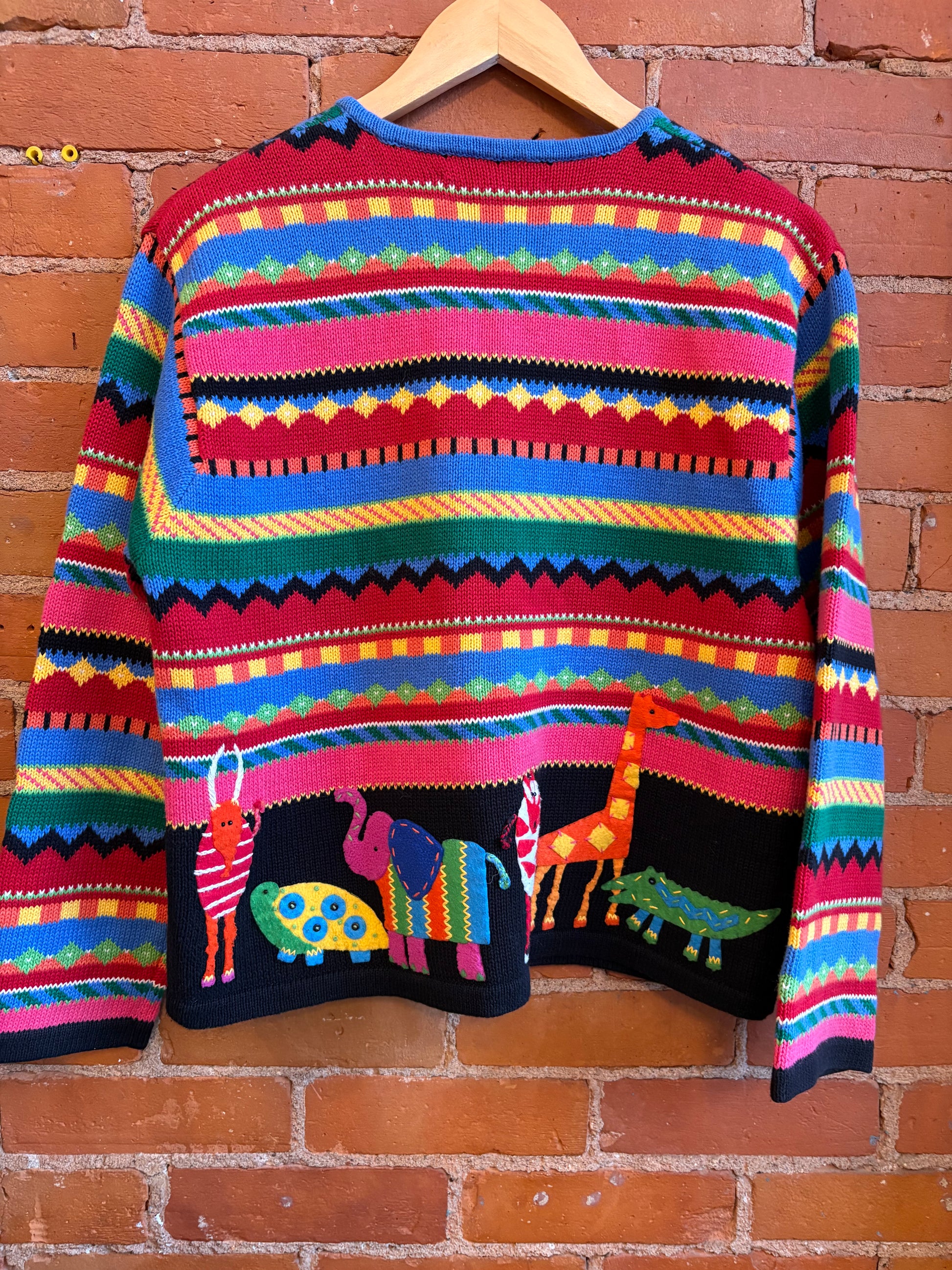 Susan Bristol brand 55% ramie / 45% cotton blend knit sweater featuring hand-embroidered animals (antelope, turtle, elephant, giraffe, crocodile, zebra). Tagged size L