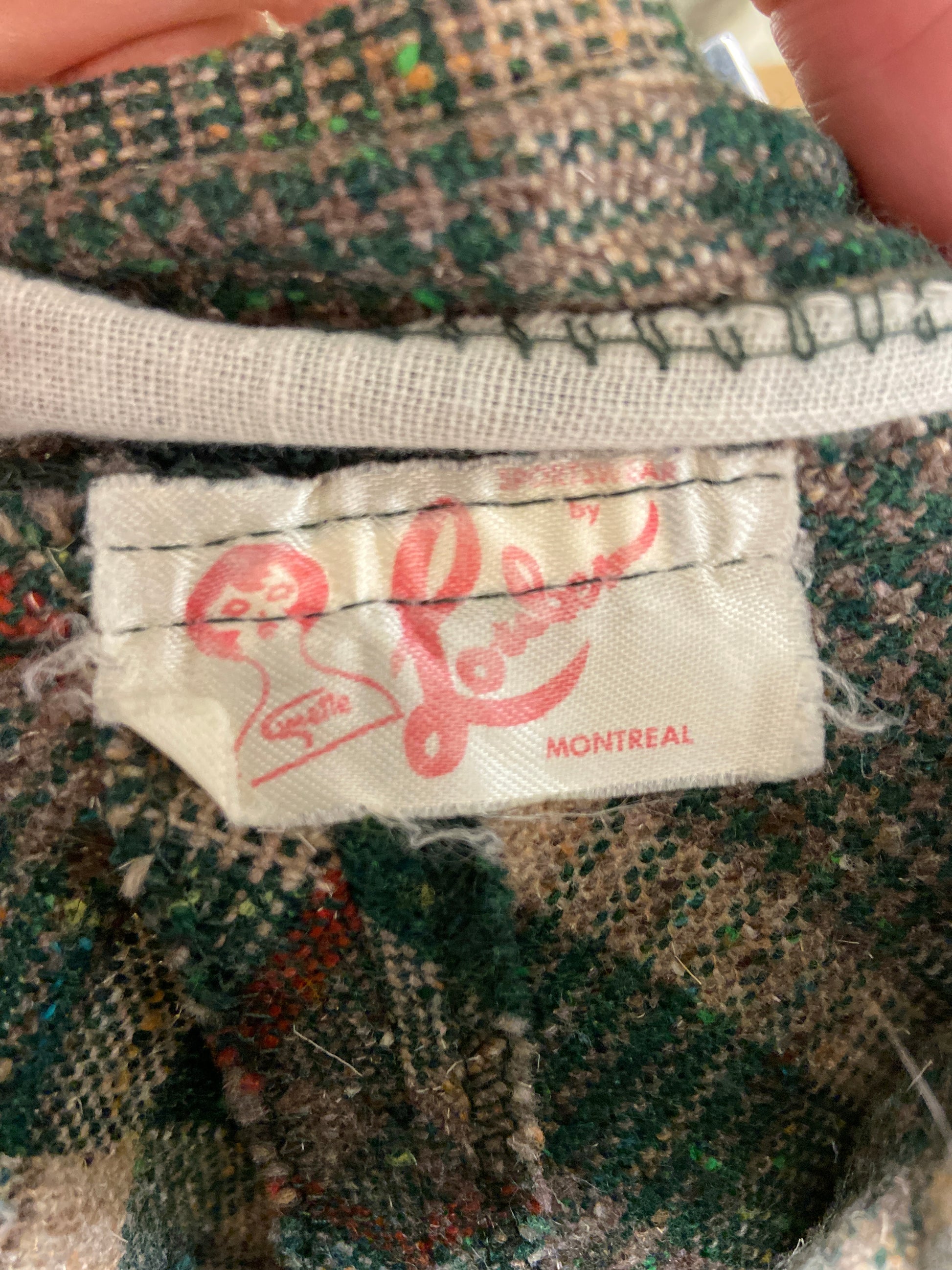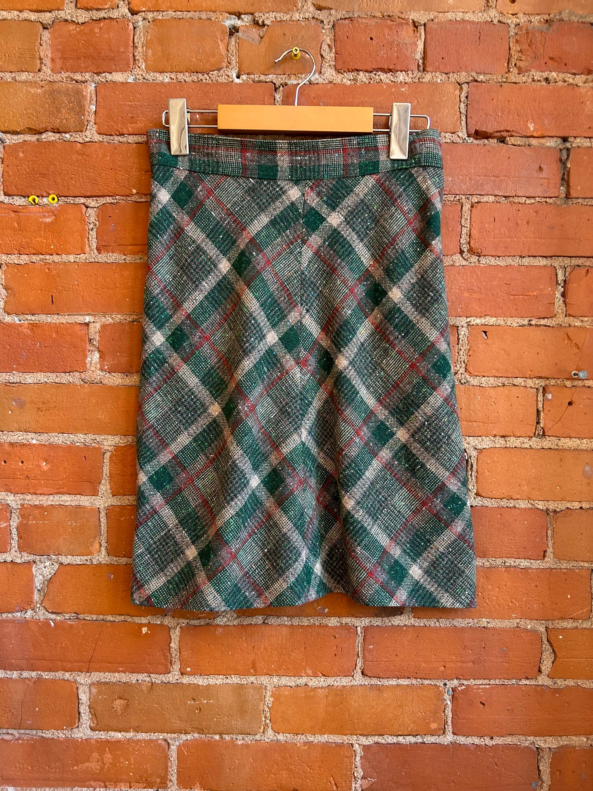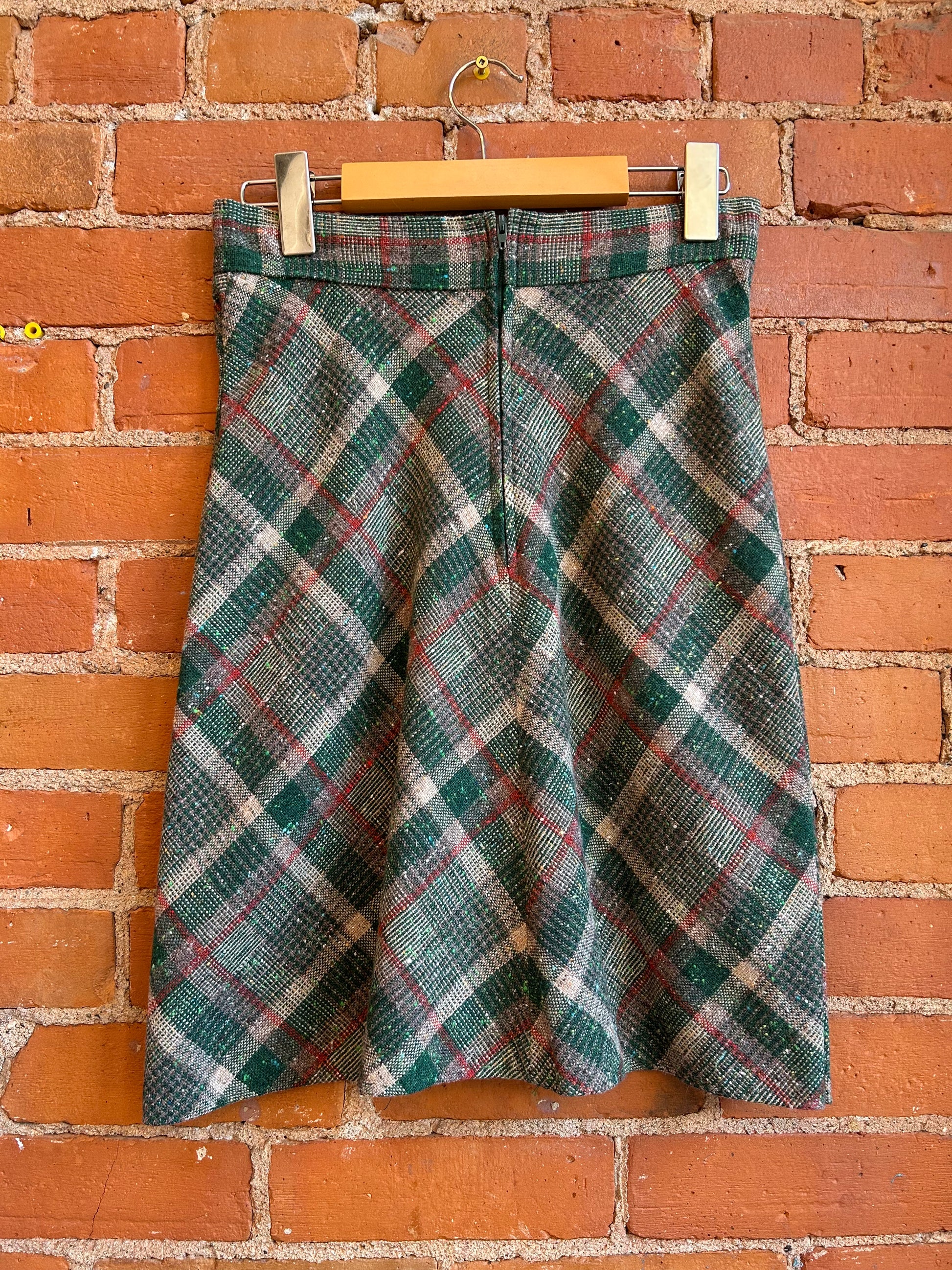 Green with red & beige plaid wool skirt. Louben Montreal brand. Back zip closure.