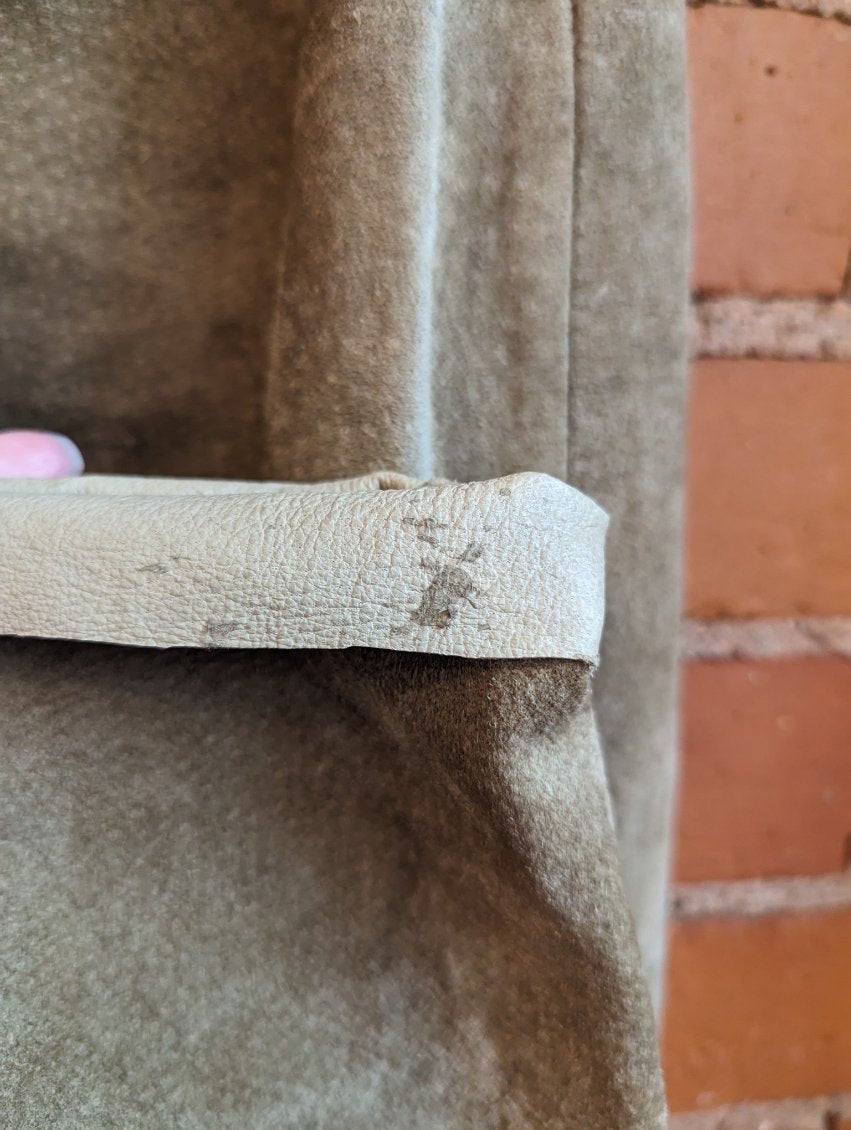 These Marquis high rise, wide leg pants are made out of a tan suede material and are fully lined with what feels like a polyester material. As is: they have raw hems and some staining on the inside of each hem that isn't visible from the outside.