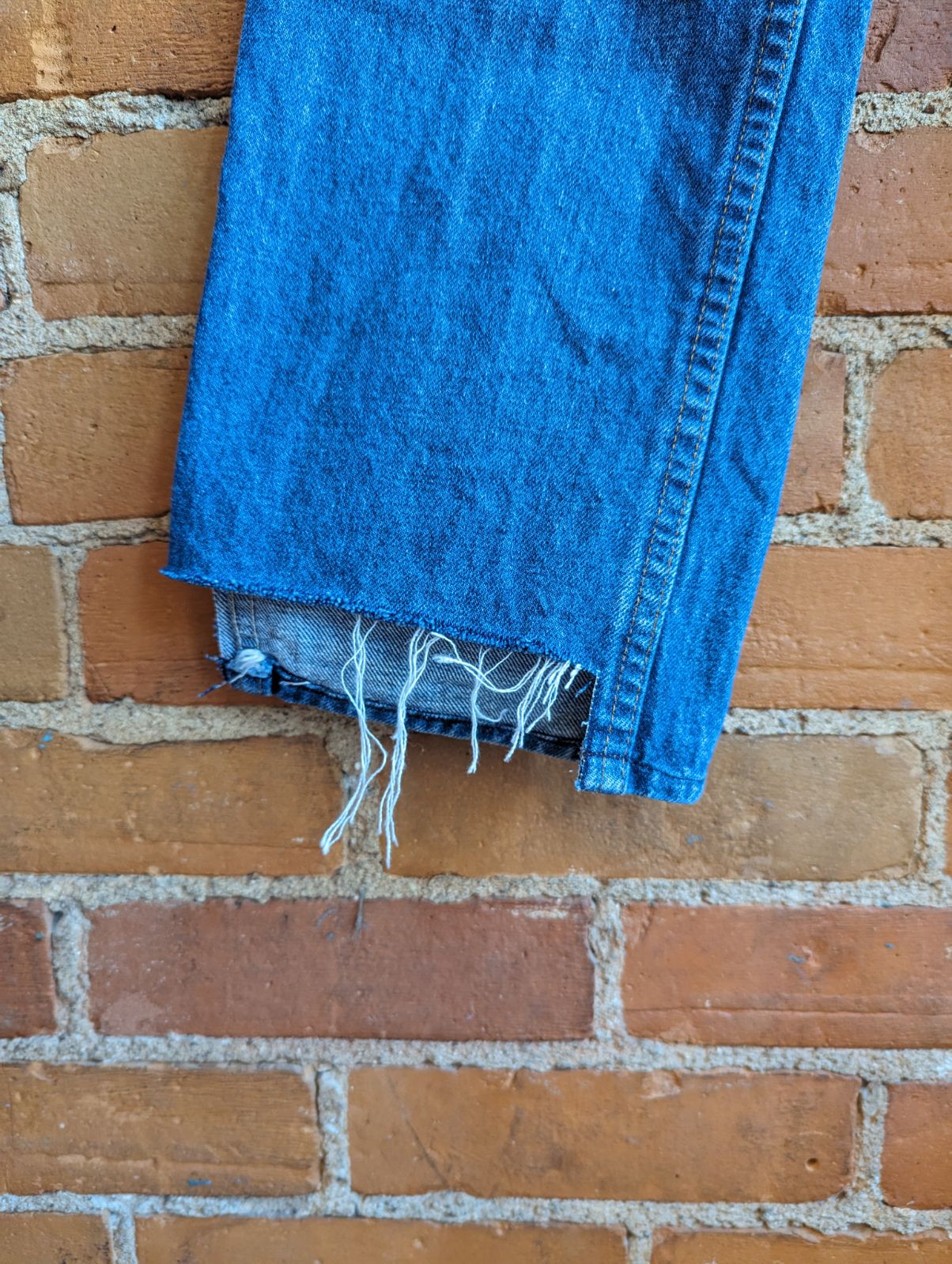 These Orange Tab Levis jeans are made out of a mid-wash 100% cotton denim and have a straight leg, high rise fit with a split hem.
