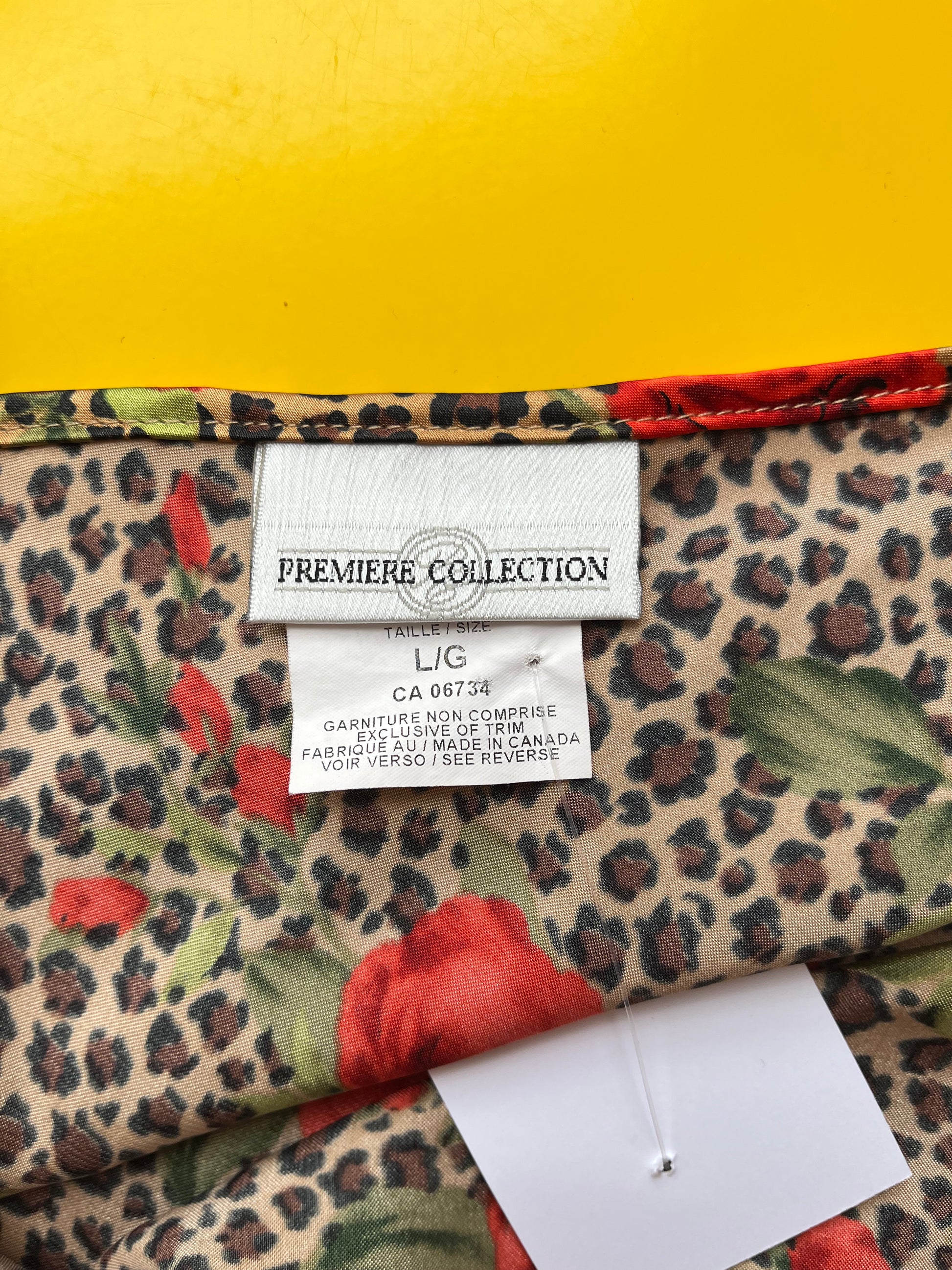 Animal print with roses and black lace trim. Tagged size L.