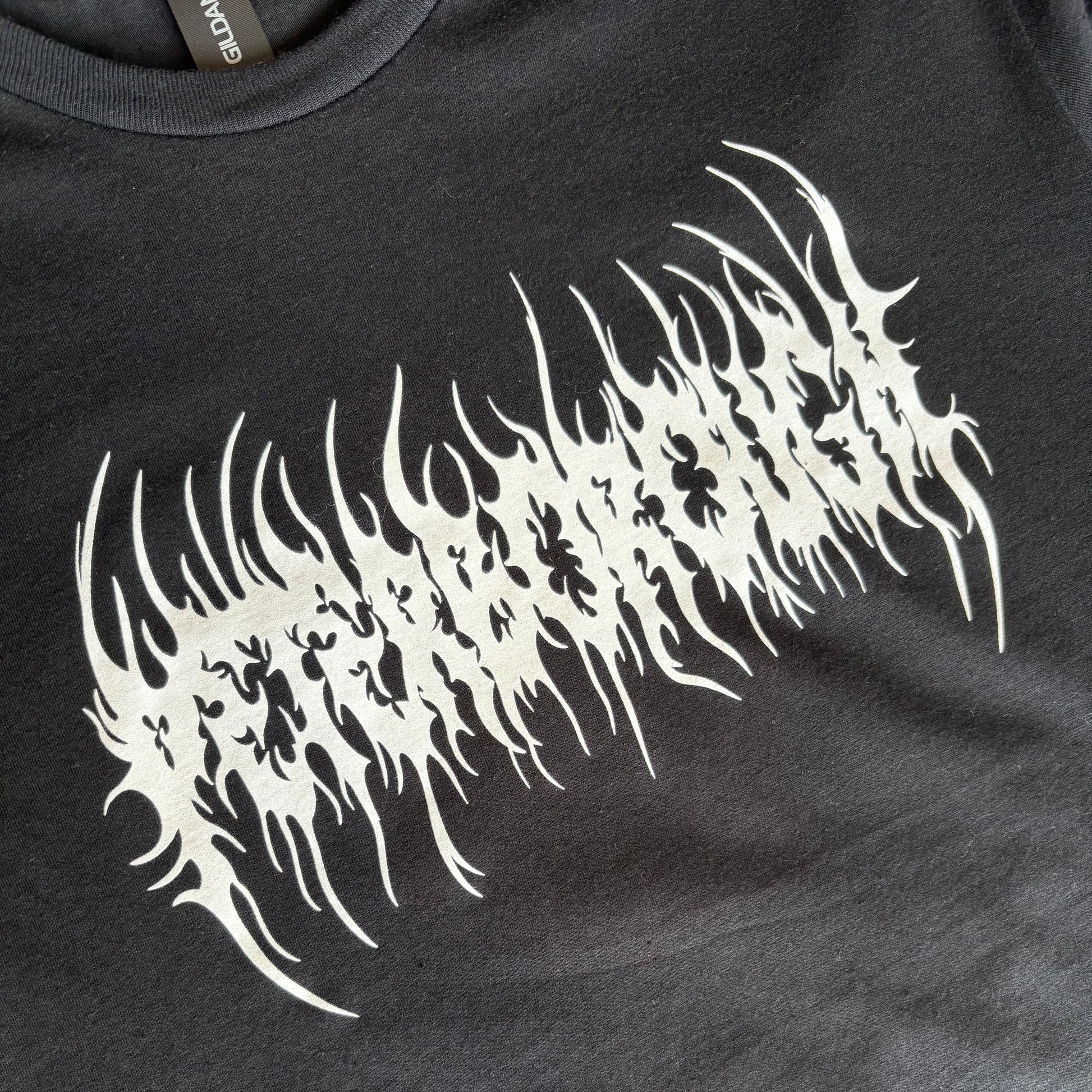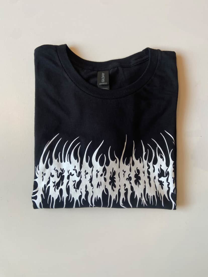 'Peterborough' in white death metal font on black t-shirt