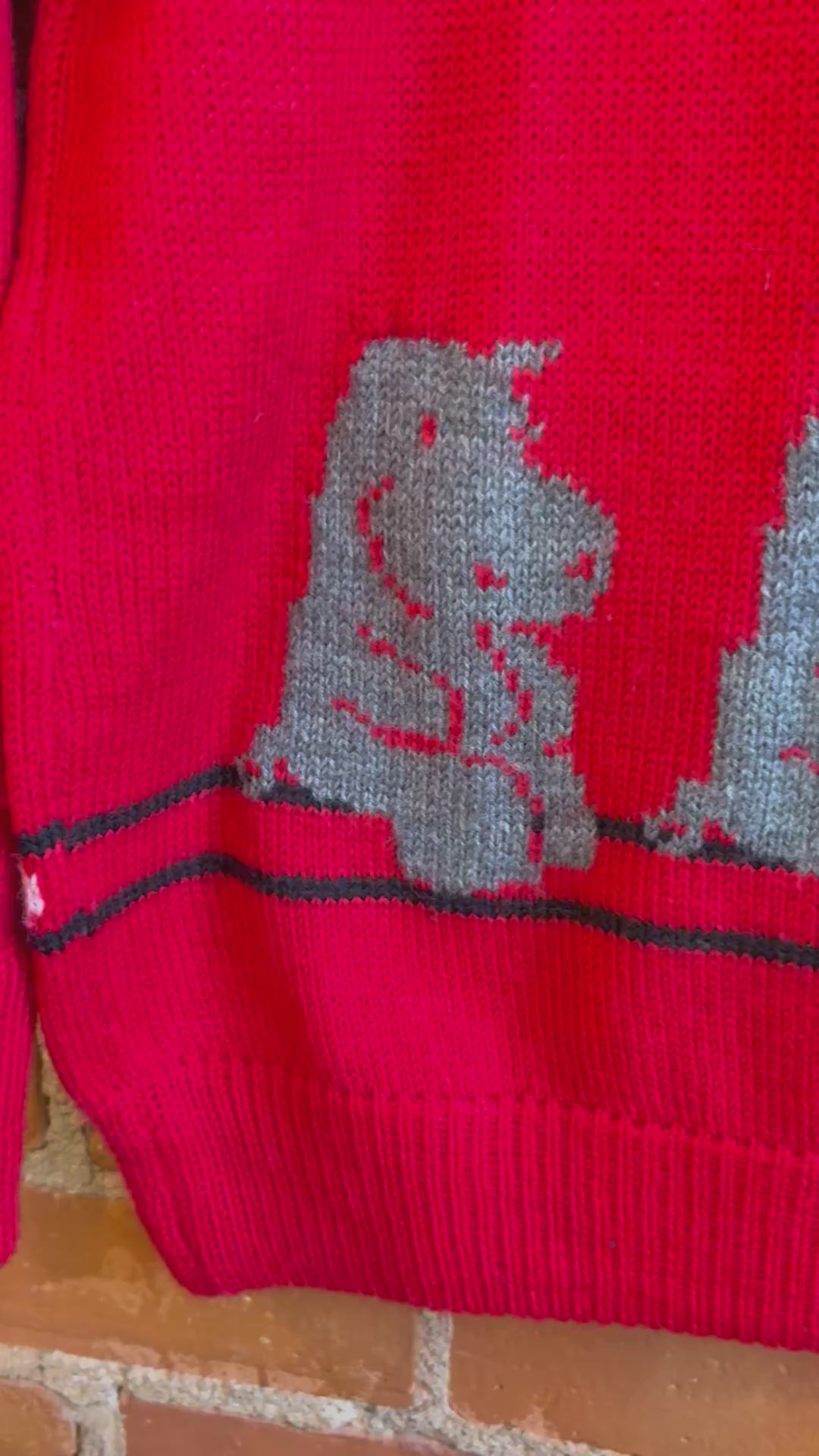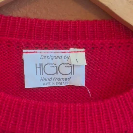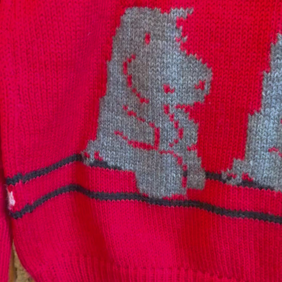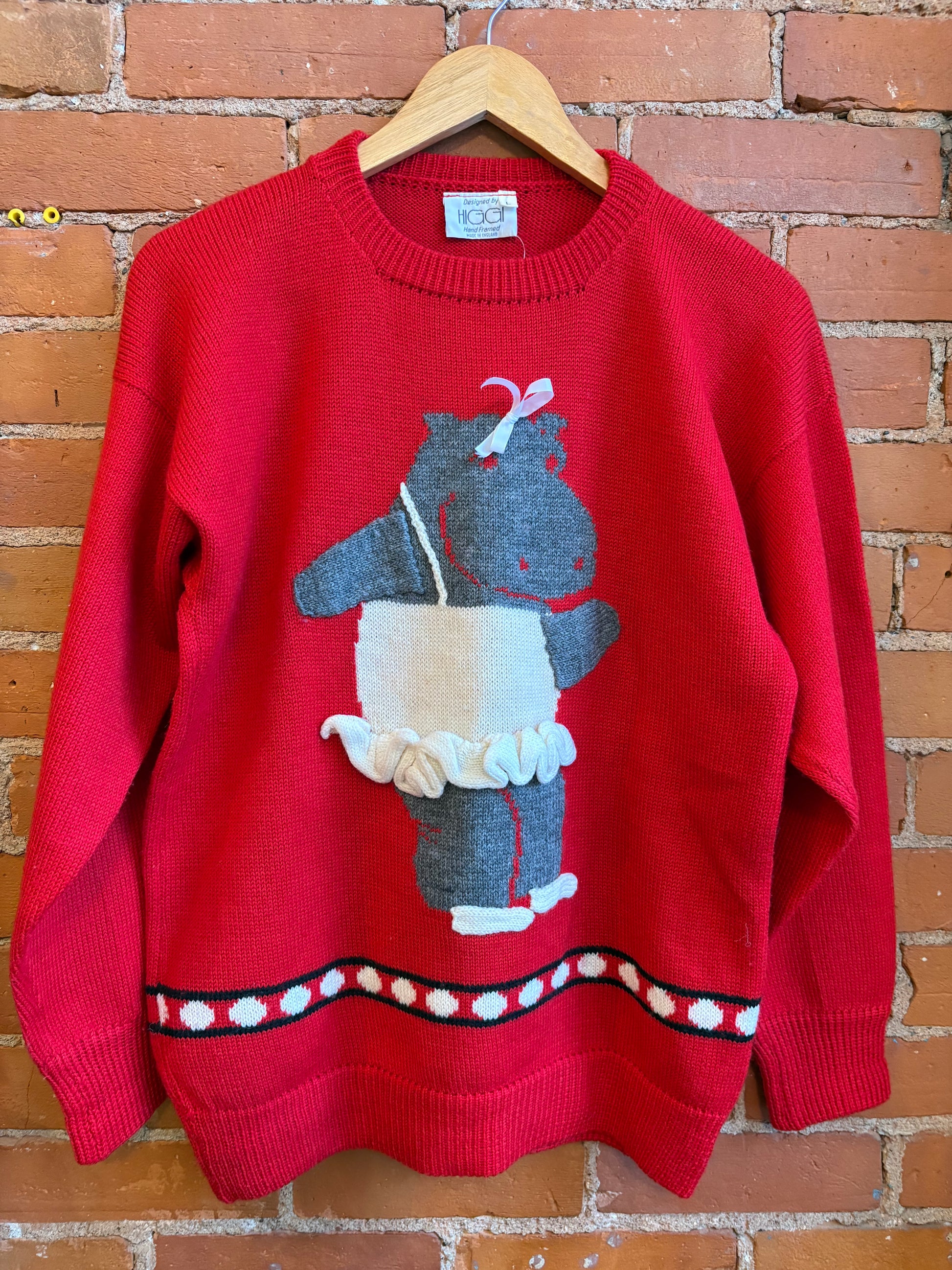 Higgi brand made in England, hand-framed. No fabric tag but feels like wool. Features a 3D knit hippo ballerina complete with a hair ribbon. Front and back design. Tagged a L