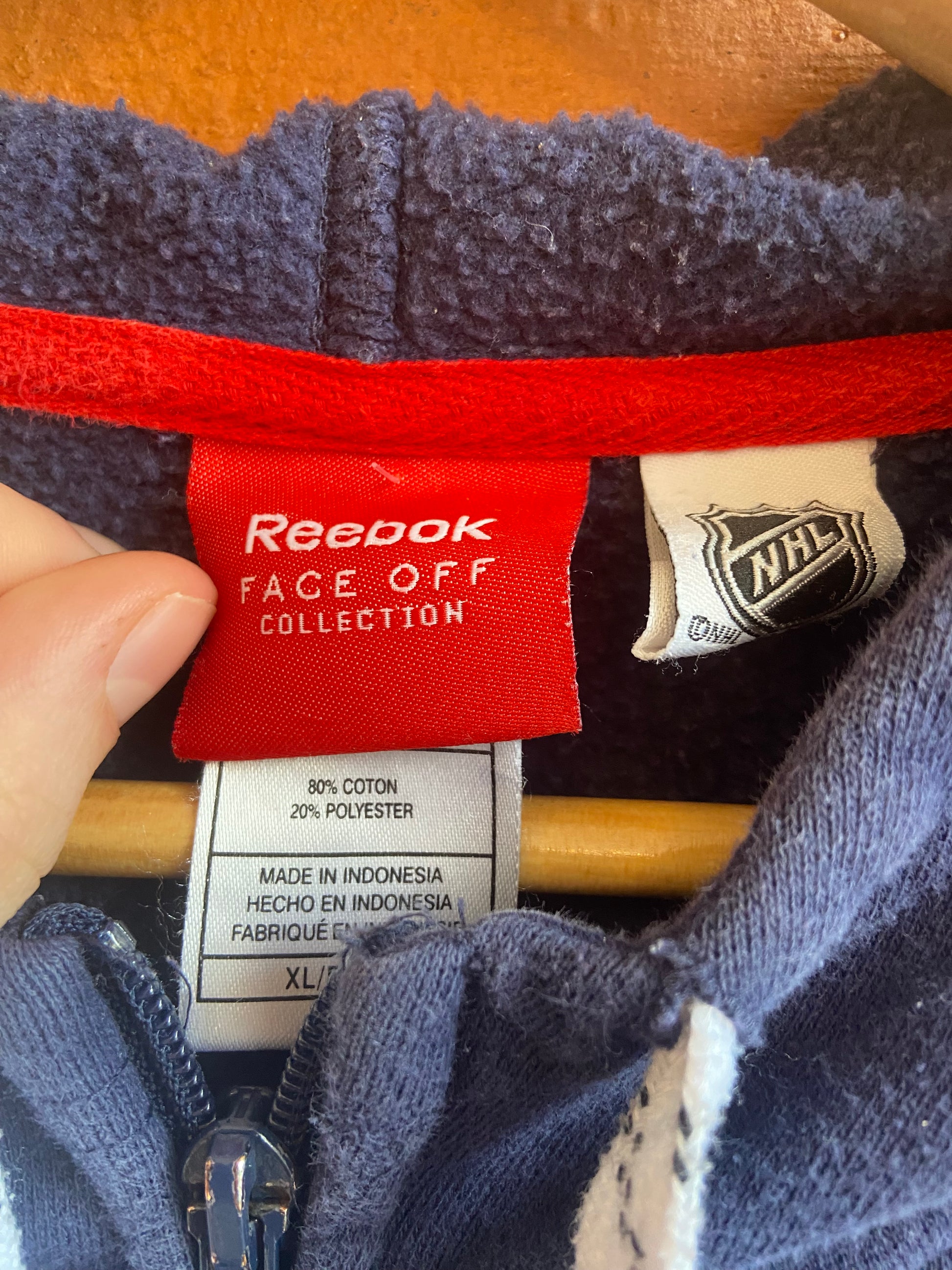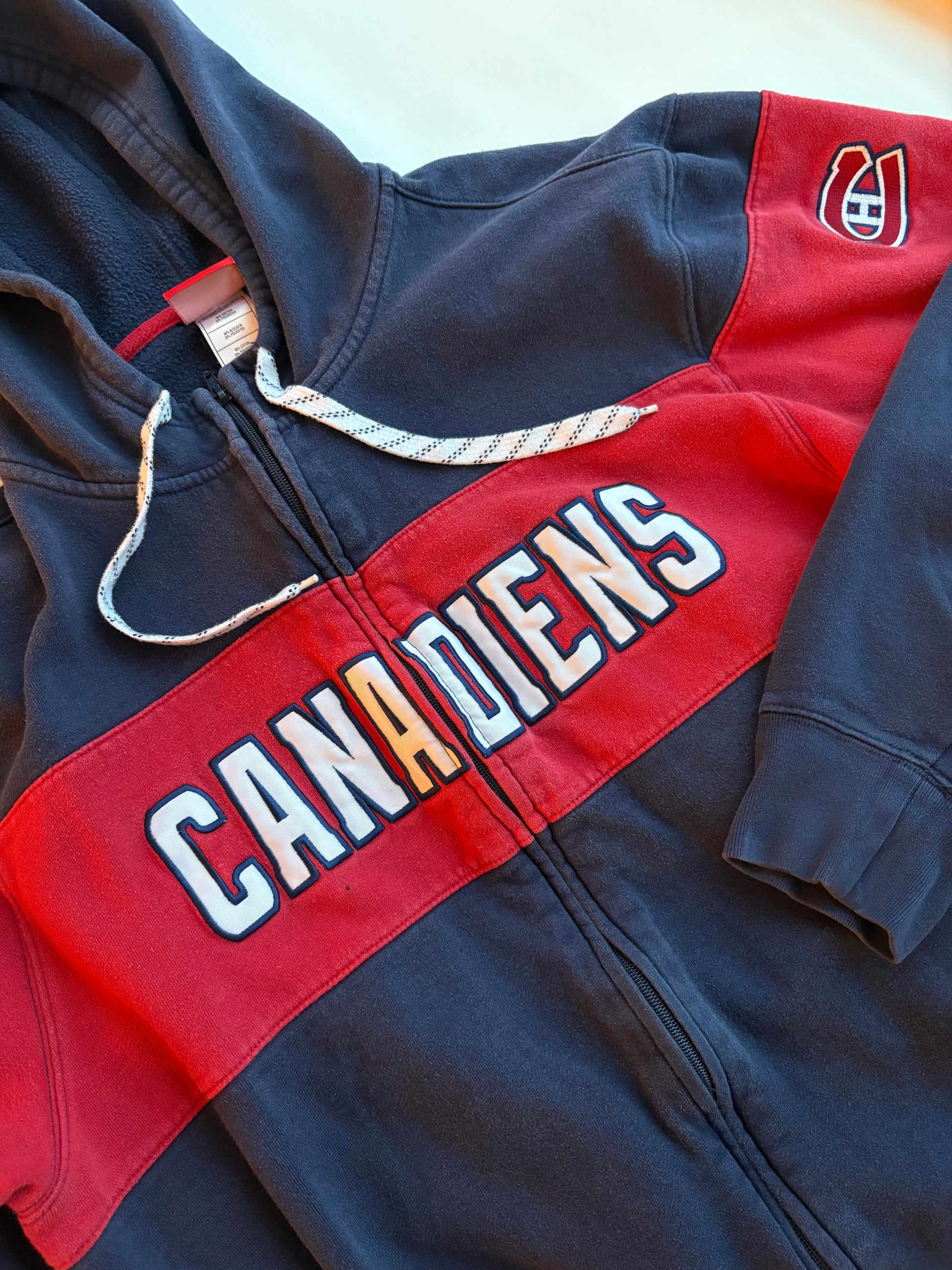 Official NHL licensed product. 80% cotton / 20% polyester. Made in Indonesia. Navy with red band across chest and arms. Embroidered 'Canadiens' across chest and logo on left arm. One tiny dot underneath the first 'A'. Zip front closure, hockey skate lace drawstring on hoodie.