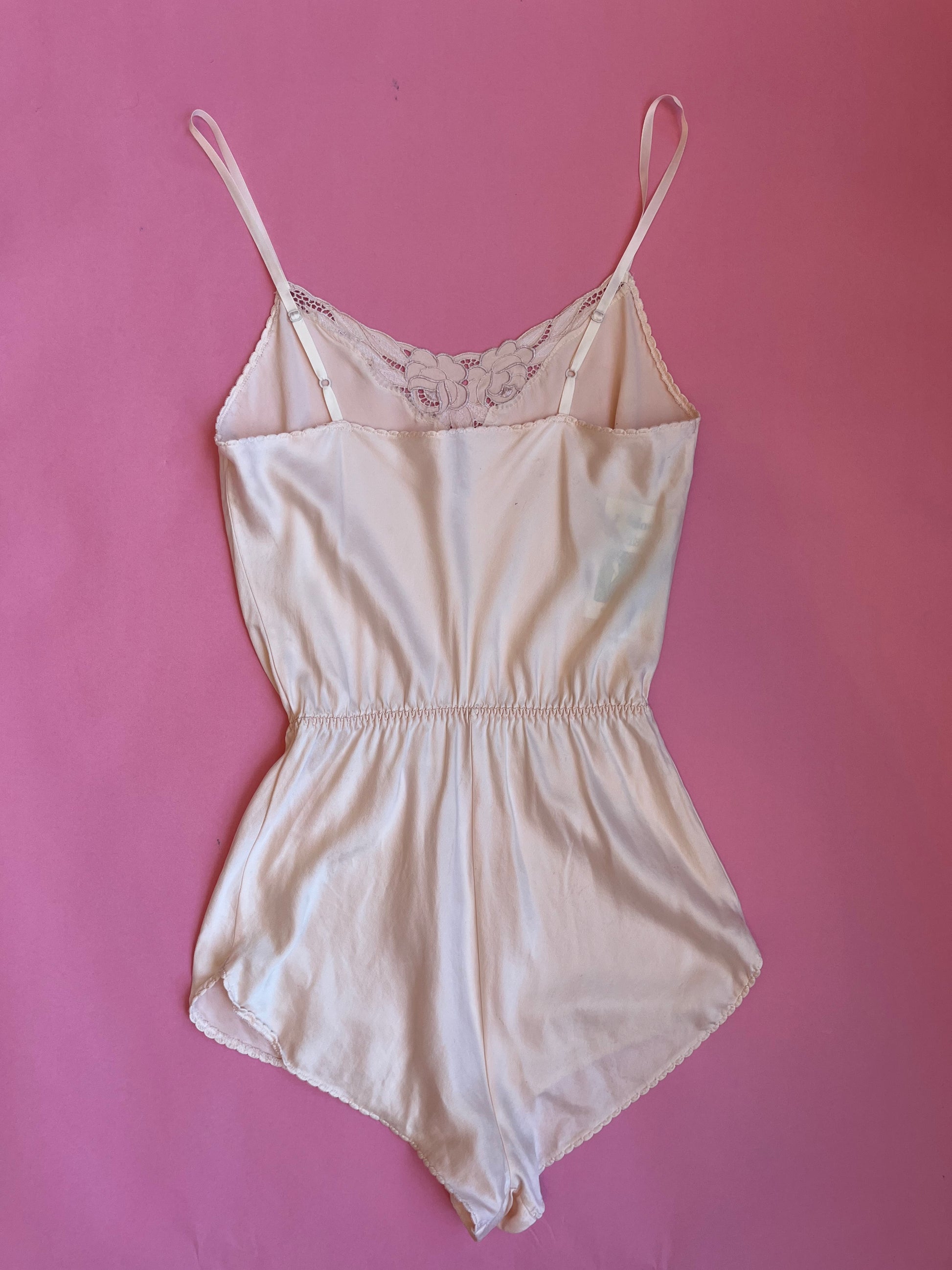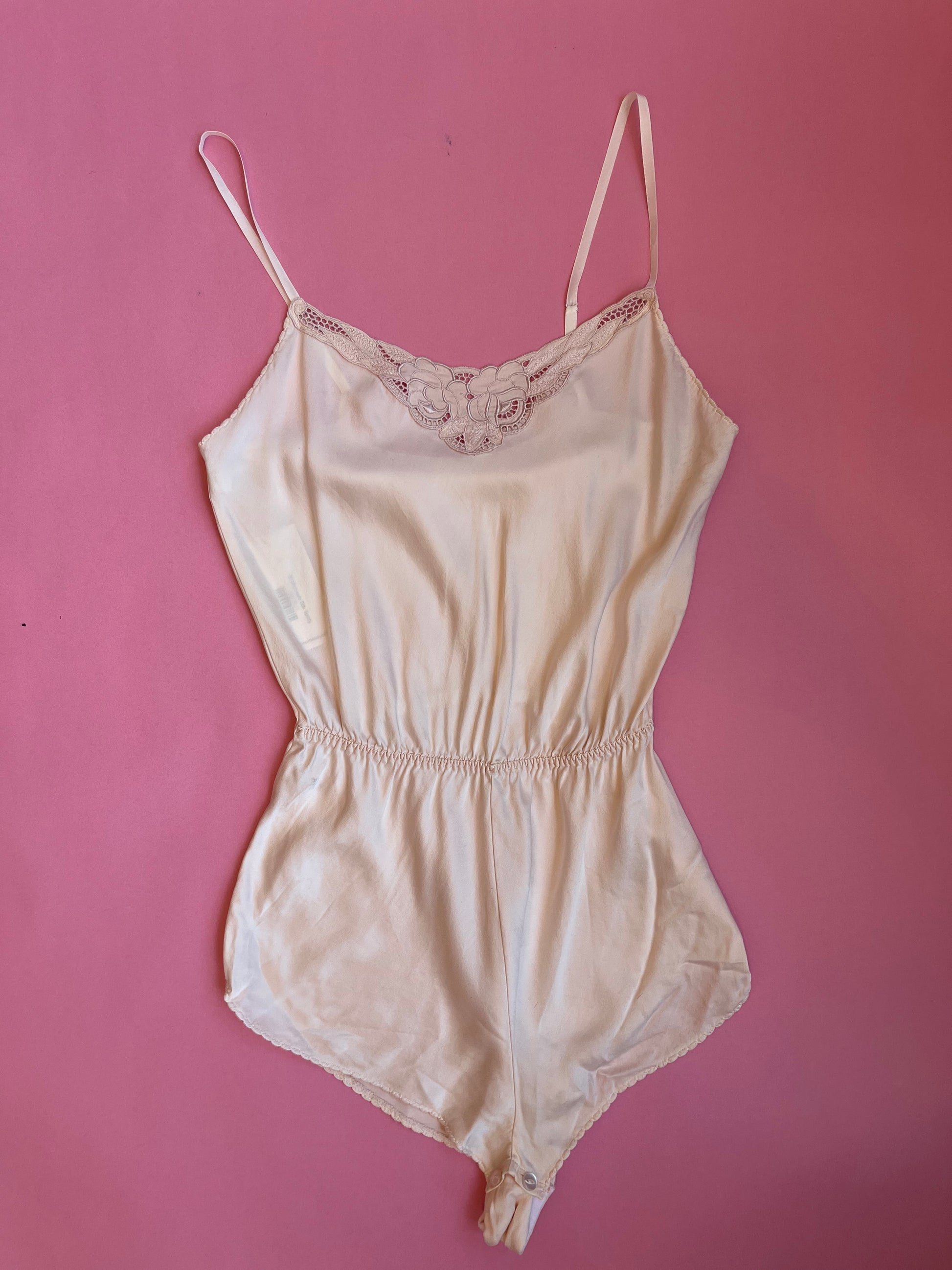 Blush 100% silk with adjustable straps. Two button closure at crotch.